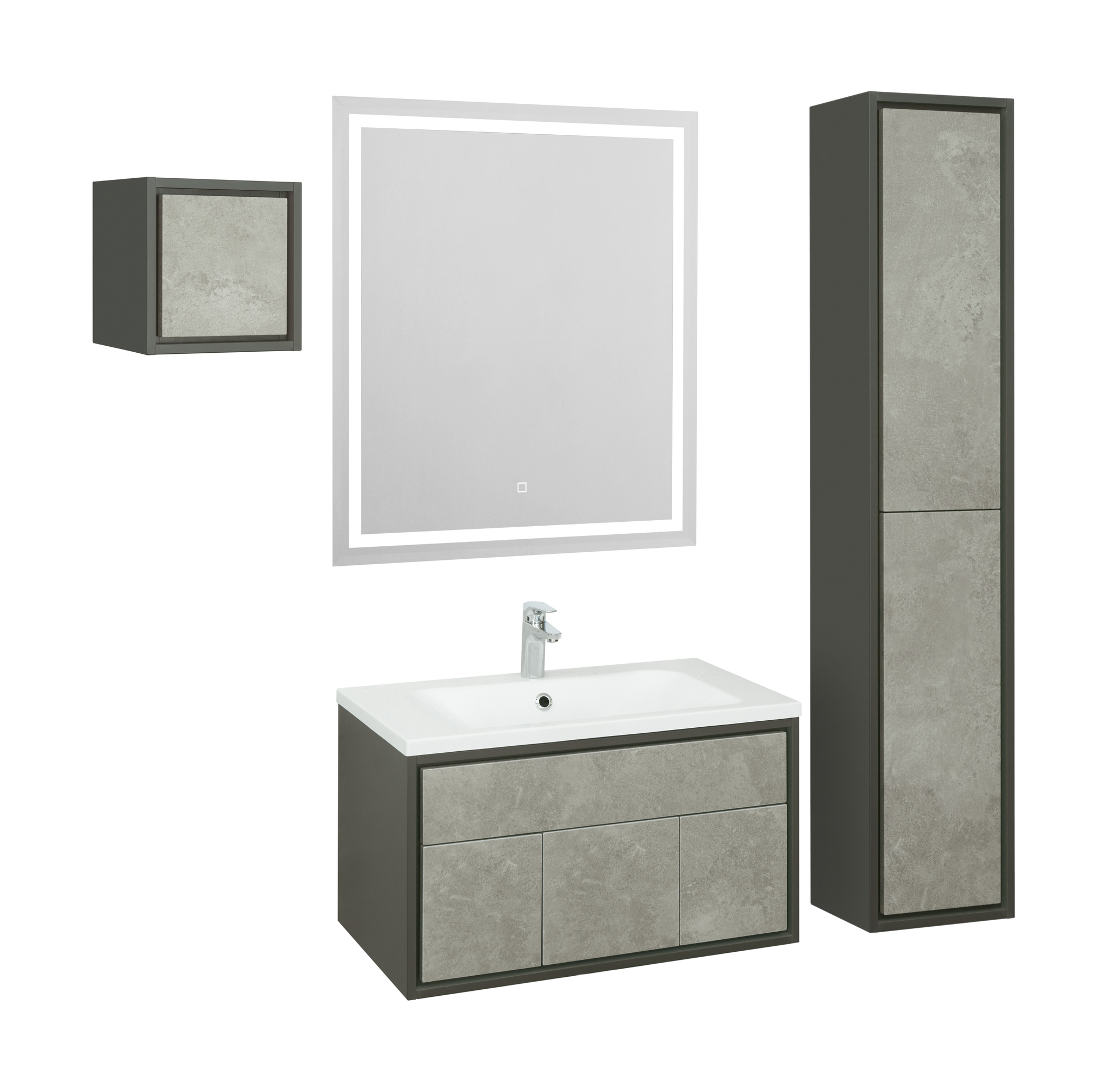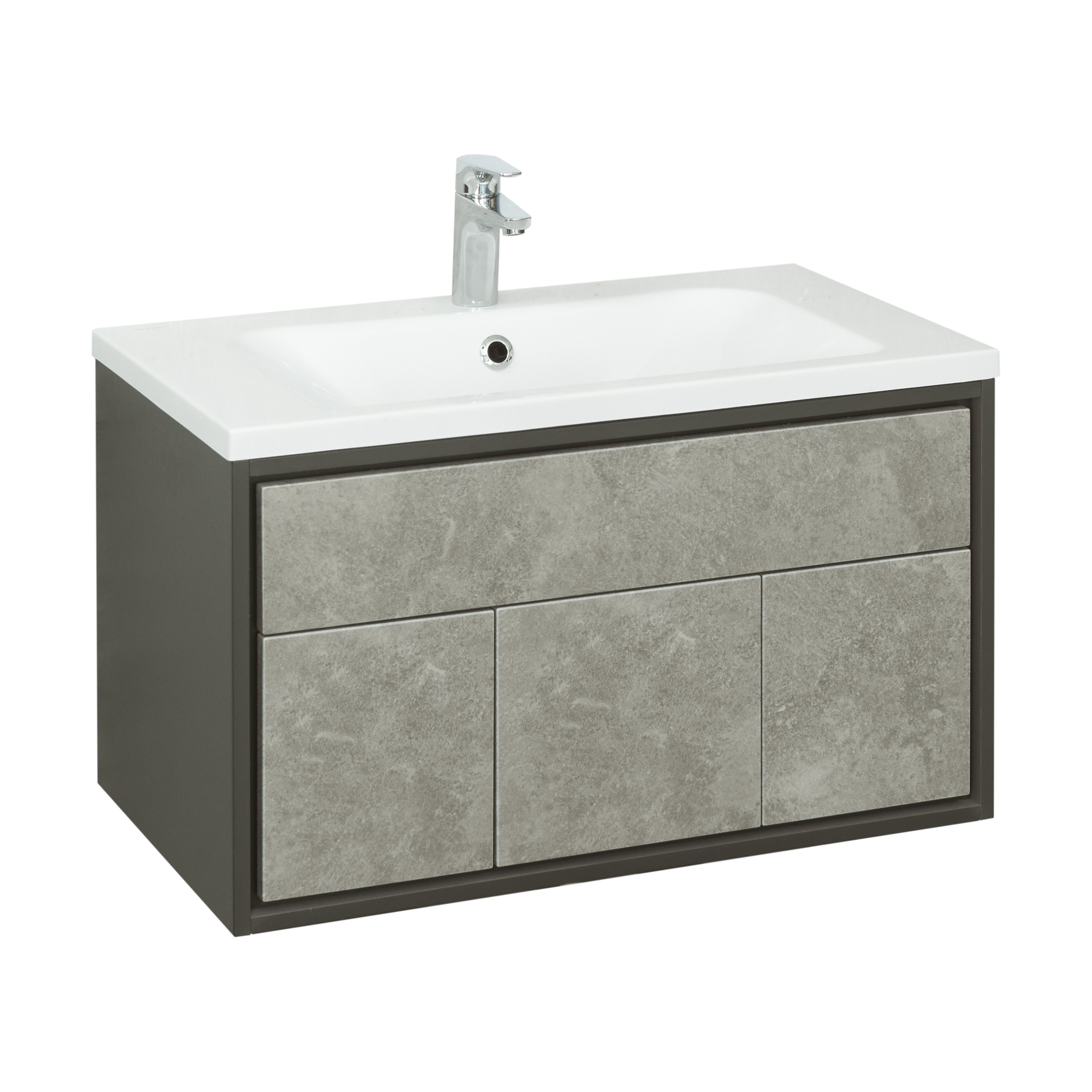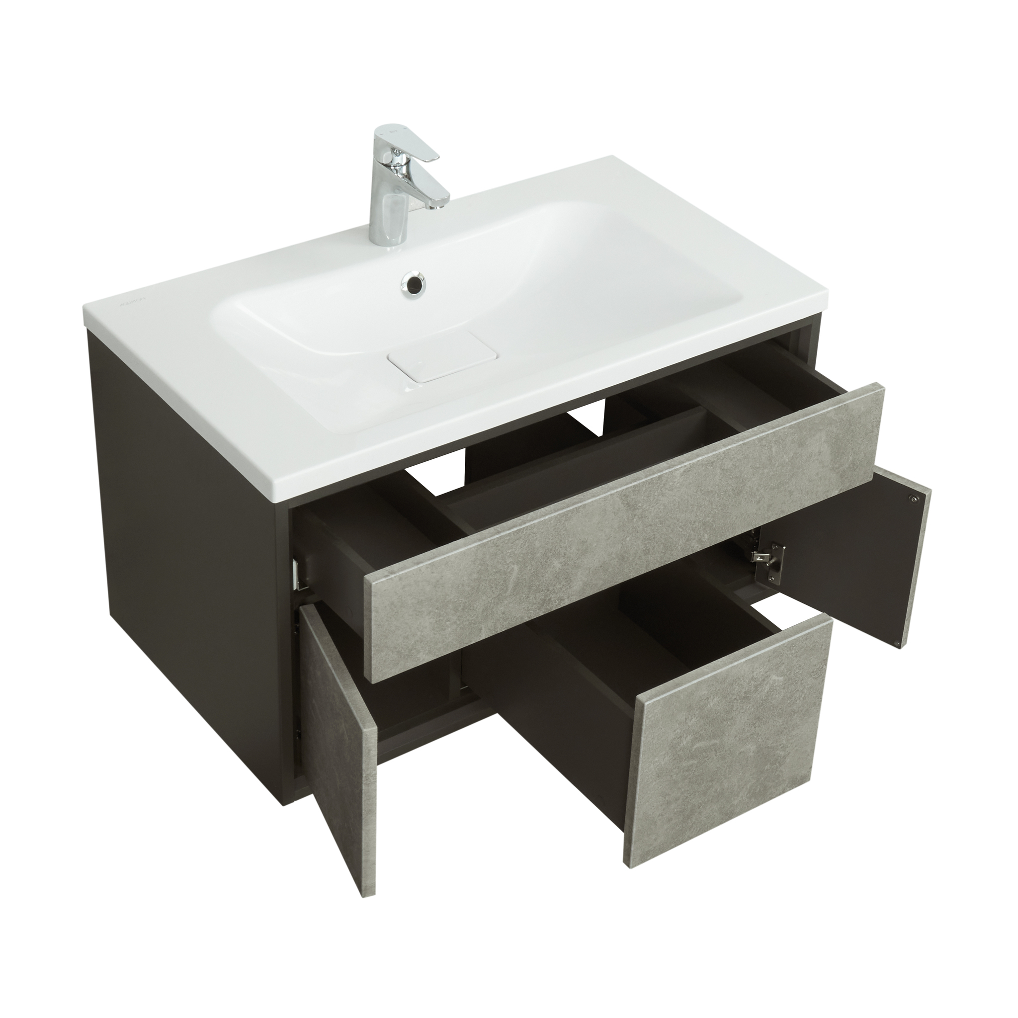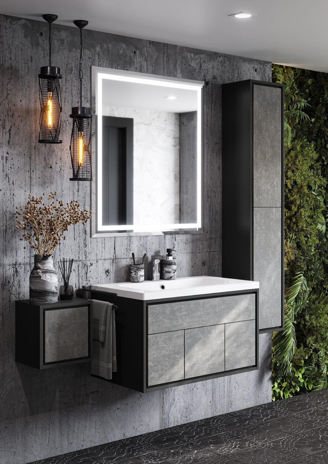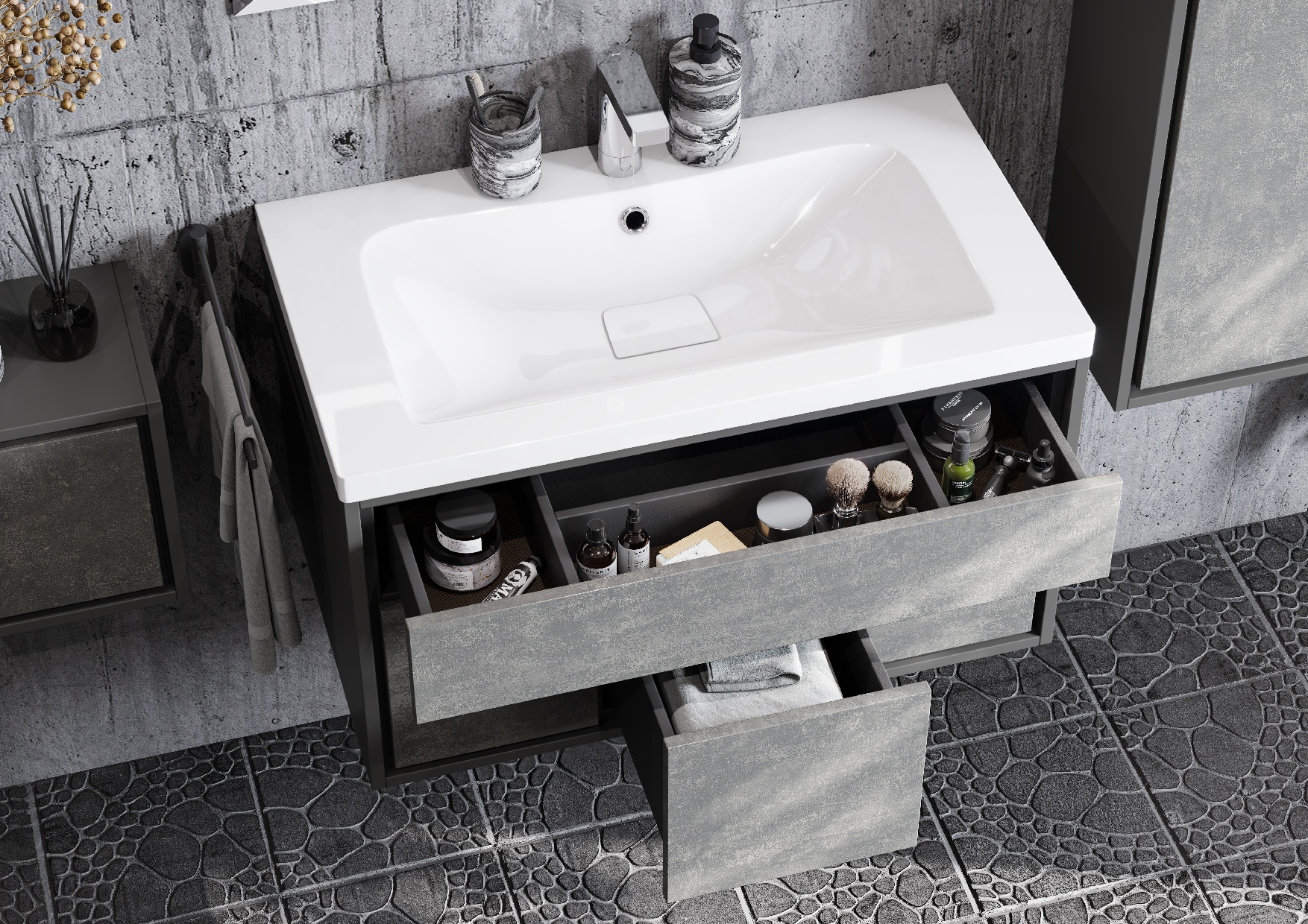 Подвесная тумба Уэльс в стиле лофт создана для истинных ценителей индустриального шика. Благородный цвет фасадов под серый бетон в сочетании с корпусом из глубокого темно-серого оттенка придаёт модели актуальное звучание, отражая эстетику современной роскоши. У данной модели двойной корпус, который выполнен из влагостойкой ЛДСП и высококачественной МДФ, покрытой матовой пленкой. Фасады также выполнены из МДФ и покрыты матовой пленкой. Отсутствие лицевой фурнитуры подчеркивает сдержанный лаконичный дизайн модели. Тумба предлагает оптимальную систему организации пространства: два вместительных ящика, верхний и центральный, выдвигаются простым нажатием благодаря удобной системе push-to-open, а справа и слева за фасадами-створками скрыты дополнительные отсеки для хранения.