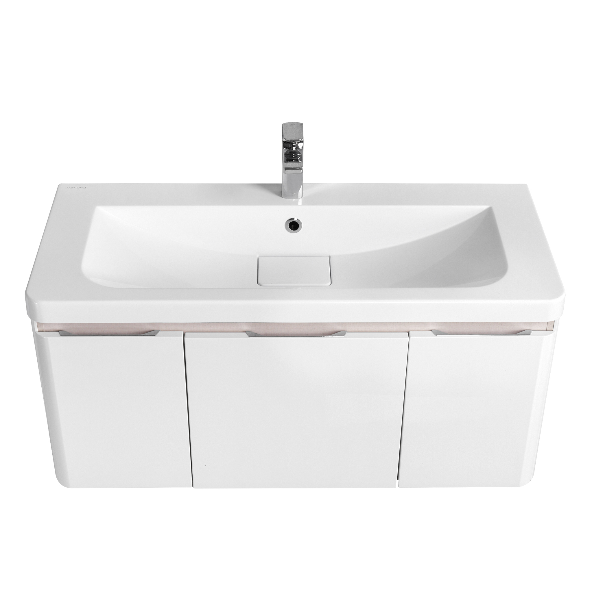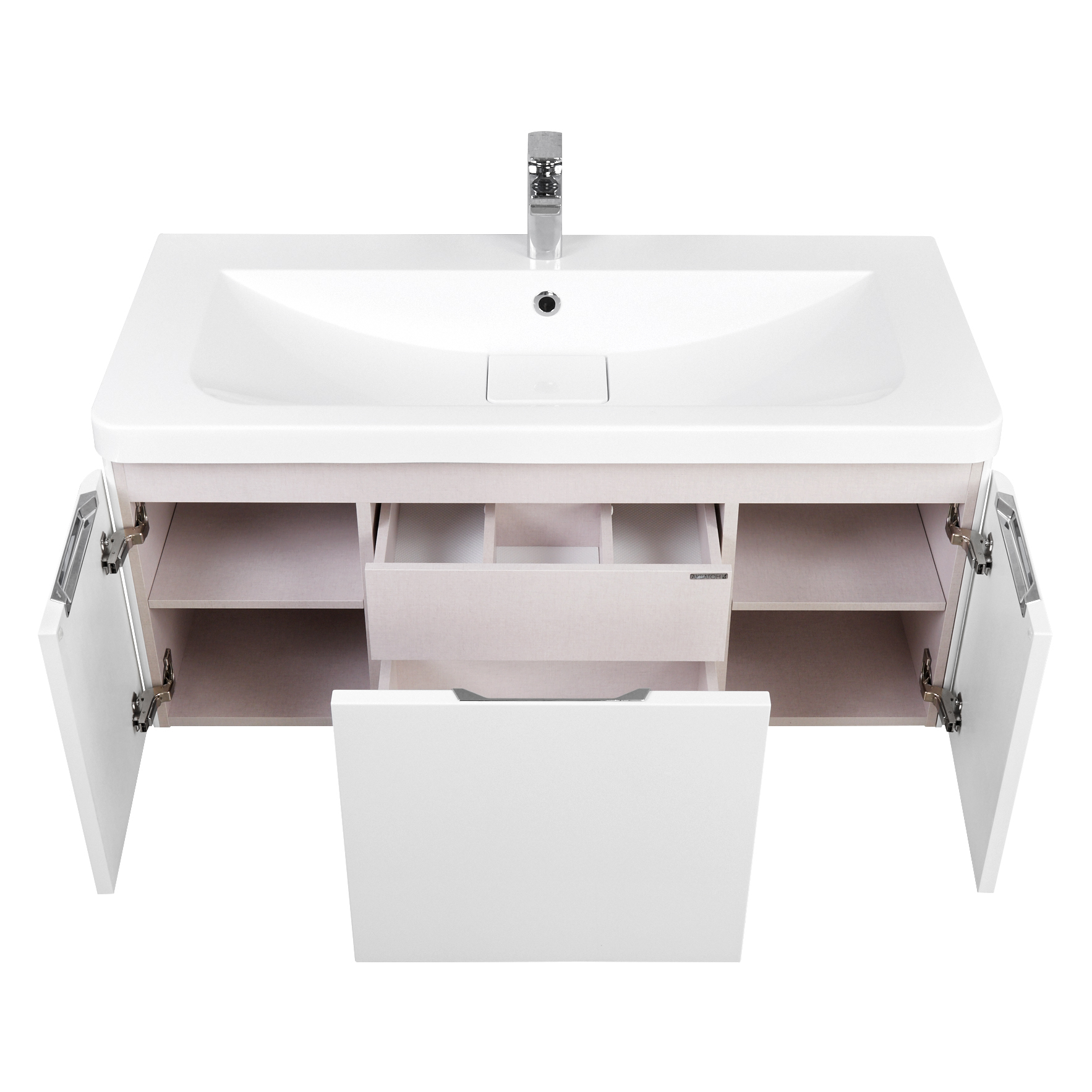 Подвесная тумба под раковину Шерилл 105 от AQUATON отражает современное понимание удобства и комфорта в ванной комнате. Модель сочетает в себе стильный лаконичный дизайн и безупречное исполнение. Корпус из влагостойкой ЛДСП и фасады из МДФ покрыты белой глянцевой краской ультрафиолетового отверждения. Плавные линии, присутствующие в каждом элементе, делают её легкой и воздушной. Скругленные углы и ручки, встроенные в фасады, делают тумбу безопасной, а продуманный функционал и система внутренней организации — удобной. Модель включает двустенный ящик полного выдвижения с системой плавного закрывания, внутренний ящик с системой push-to-open, а за боковыми распашными фасадами находятся дополнительные отсеки с полками. Таким образом, каждая вещь будет на своем месте.