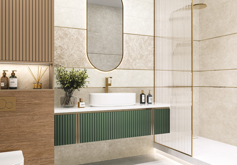 Коллекция матовой настенной плитки Garden в формате 300×900 мм представляет собой сочетание рельефной текстуры камня и тропических листьев. Теплая цветовая палитра коллекции выполнена в бежевых оттенках. Оригинальный декоративный массив с растительным узором листьев имеет многослойные градиенты и тени, за счет чего рисунок кажется живым и объемным. Флористичный узор продолжается на каждой плитке, создавая непрерывный рисунок. Дополнена серия рельефной плиткой с деревянной текстурой, она гармонично сочетается с бежевыми оттенками, расставляя акценты и выделяя функциональные зоны помещения. Плитки имеют ректифицированный край, что позволяет осуществить укладку с минимальным швом. В состав коллекции входит золотой бордюр, ректифицированный керамогранит в формате 600×600 мм, керамогранит с текстурой дерева в формате 200×900 мм. Такая коллекция станет универсальным фоном для современного уютного интерьера.