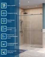 Коллекция сохраняет все преимущества минималистичного дизайна: минимум деталей, узкие профили и прозрачное стекло, которое не перегружает пространство, подчёркивая ощущение простора в ванной. Особая фишка — ролики увеличенного диаметра, обеспечивающие сверх плавное и бесшумное скольжение стеклянной панели без малейших усилий. Эти крупные элементы визуально доминируют, добавляя ограждению нотку надёжности и индустриальной эстетики в минималистичном стиле. Благодаря им ощущается лёгкость движения двери, усиливающая общее впечатление роскоши и стабильности, будто конструкция парит.