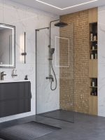 Уникальное решение для защиты ванной комнаты от брызг. Бескаркасное стекло душевой перегородки walk-in расширяет пространство и добавляет ему элегантности. Душевые