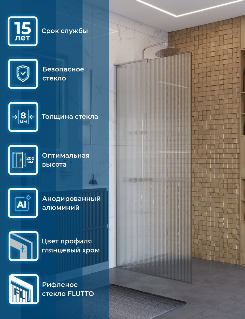 Уникальное решение для защиты ванной комнаты от брызг. Бескаркасное стекло душевой перегородки walk-in расширяет пространство и добавляет ему элегантности. Душевые