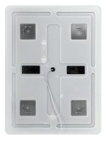 Обратная сторона зеркала защищена пластиковой панелью от попадания воды и влаги.При отсутствии внешнего питания установки сохраняются и часы будут отсчитывать время несколько месяцев, получая энергию от встроенного элемента питания.