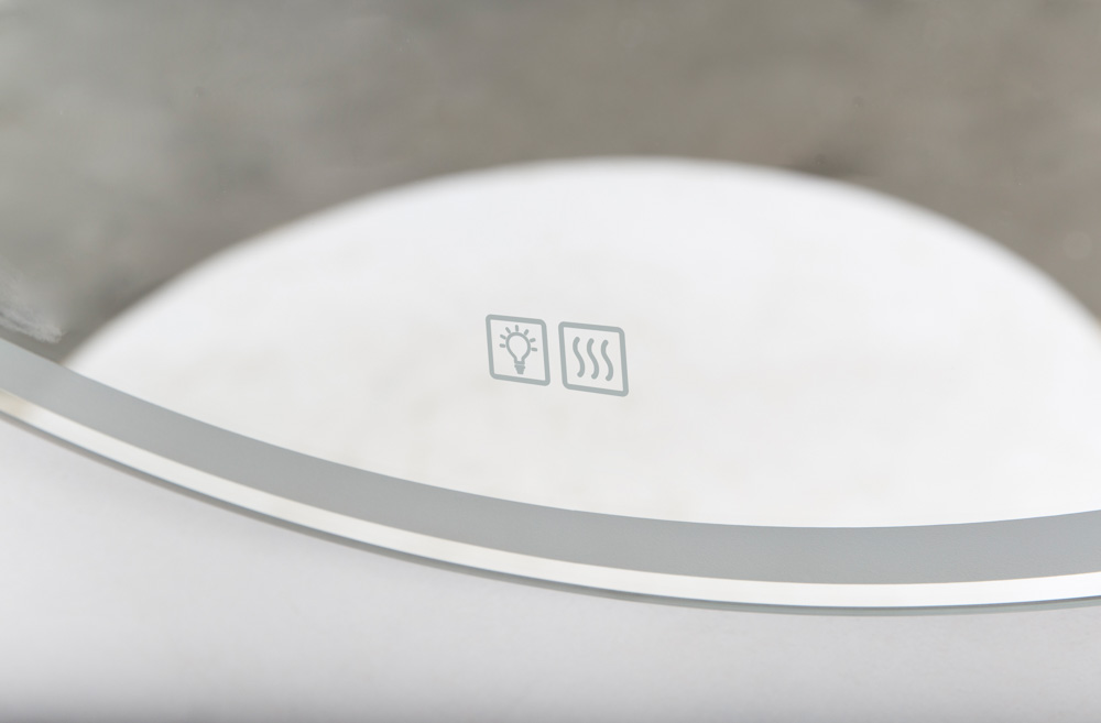 На зеркале установлен двойной сенсор, блок увеличеной мощности, с помощью которого производиться отдельное включение подсветки и подогрева зеркала. Однократное нажатие сенсора включает или выключает функцию, соответственно символу на зеркале, длительное удержание выключает подсветку клавиш сенсора.