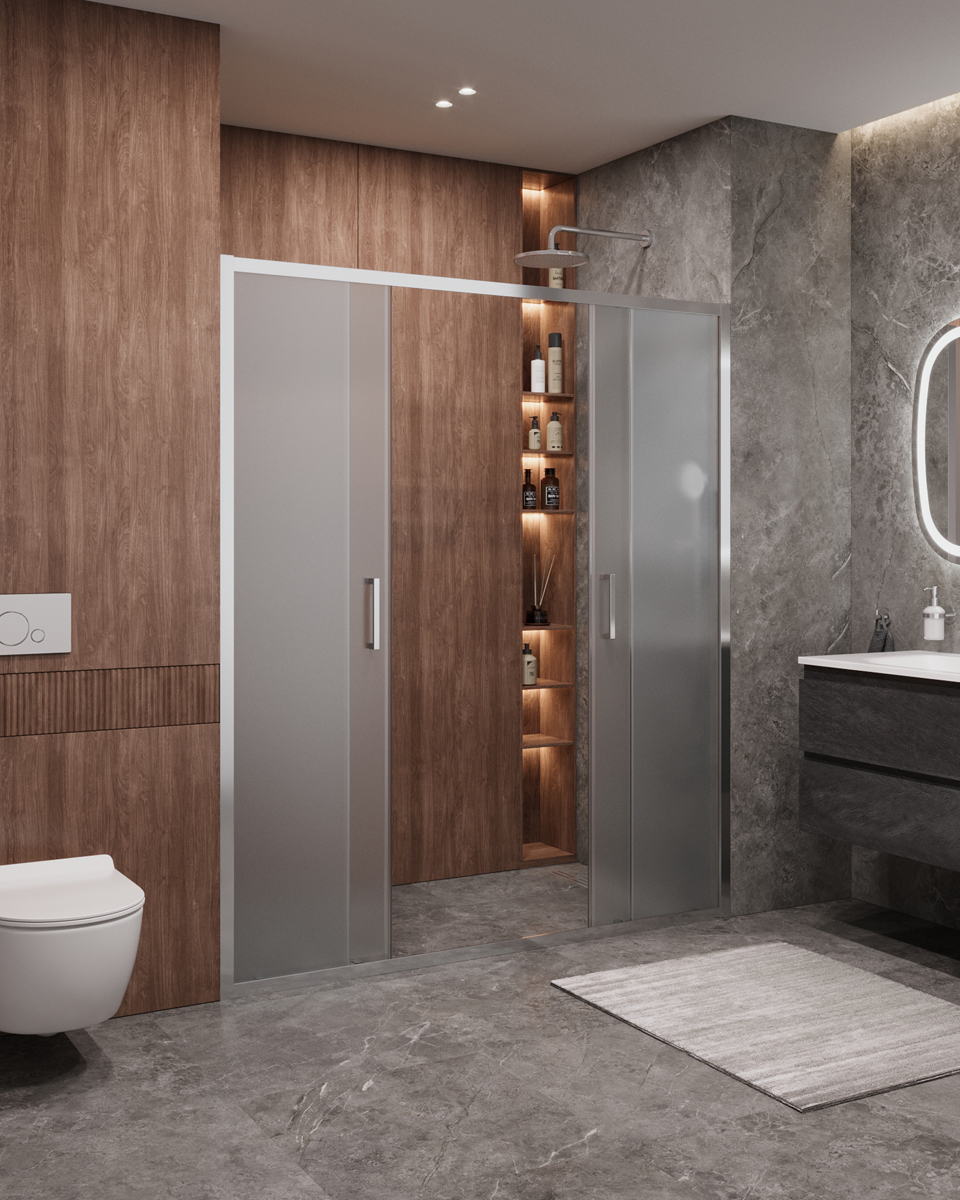 Уникальное решение для защиты ванной комнаты от брызг. Бескаркасное стекло душевой перегородки walk-in расширяет пространство и добавляет ему элегантности. Душевые