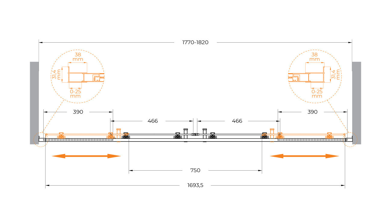 Ширина изделий до 180 см с уникальной возможностью создания еще больших размеров за счет дополнительных неподвижных элементов шириной 20 и 30 см.