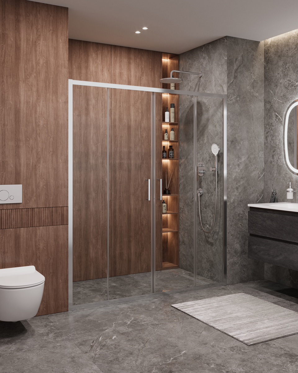 Уникальное решение для защиты ванной комнаты от брызг. Бескаркасное стекло душевой перегородки walk-in расширяет пространство и добавляет ему элегантности. Душевые
