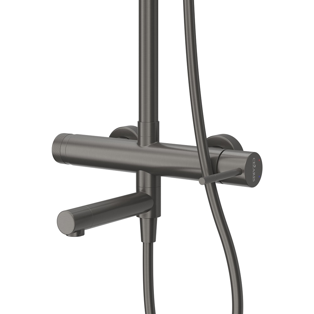 •Смеситель душевой стойки оснащен поворотным изливом с дивертором (переключателем на излив/верхний, ручной душ)