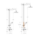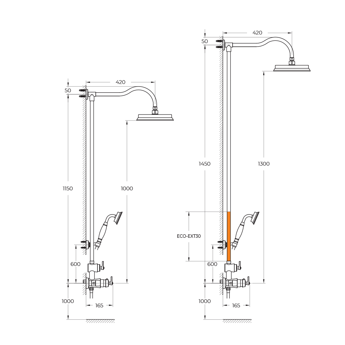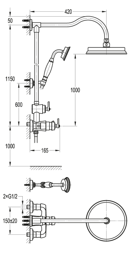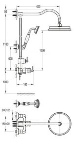 Лейка, настенный держатель, смеситель, шланг, верхний душ, переключатель потоков, эксцентрики |