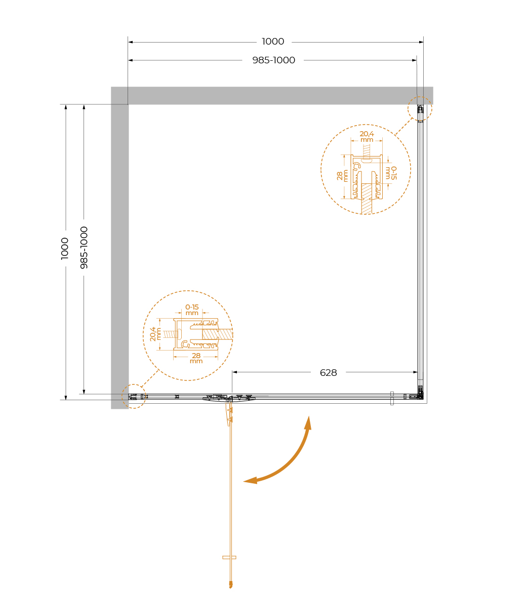 2. Двухточечное крепление петель к стеклу • Гарантия отсутствия провисания дверей и нарушения герметичности душевого ограждения.