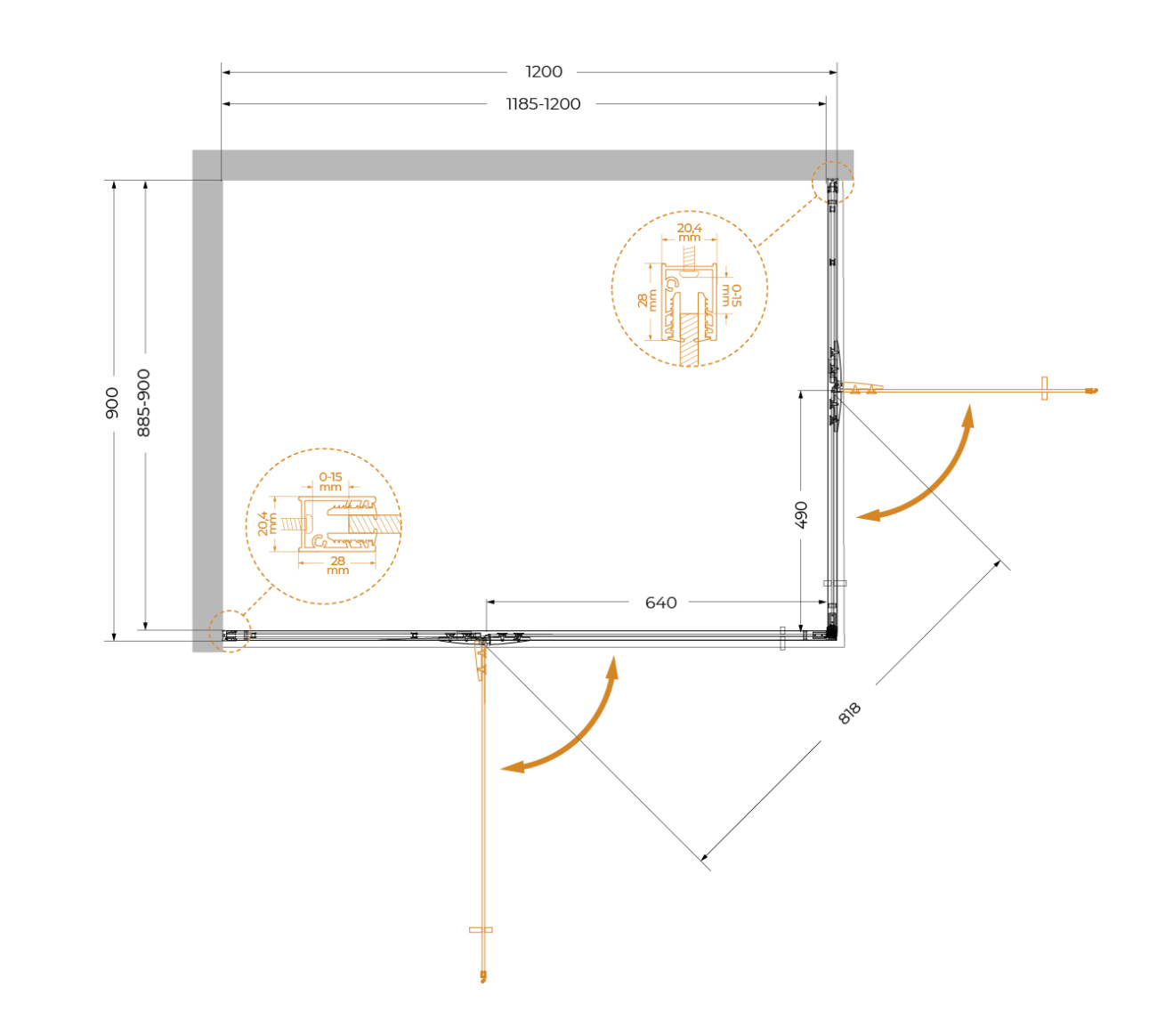 2. Двухточечное крепление петель к стеклу • Гарантия отсутствия провисания дверей и нарушения герметичности душевого ограждения.