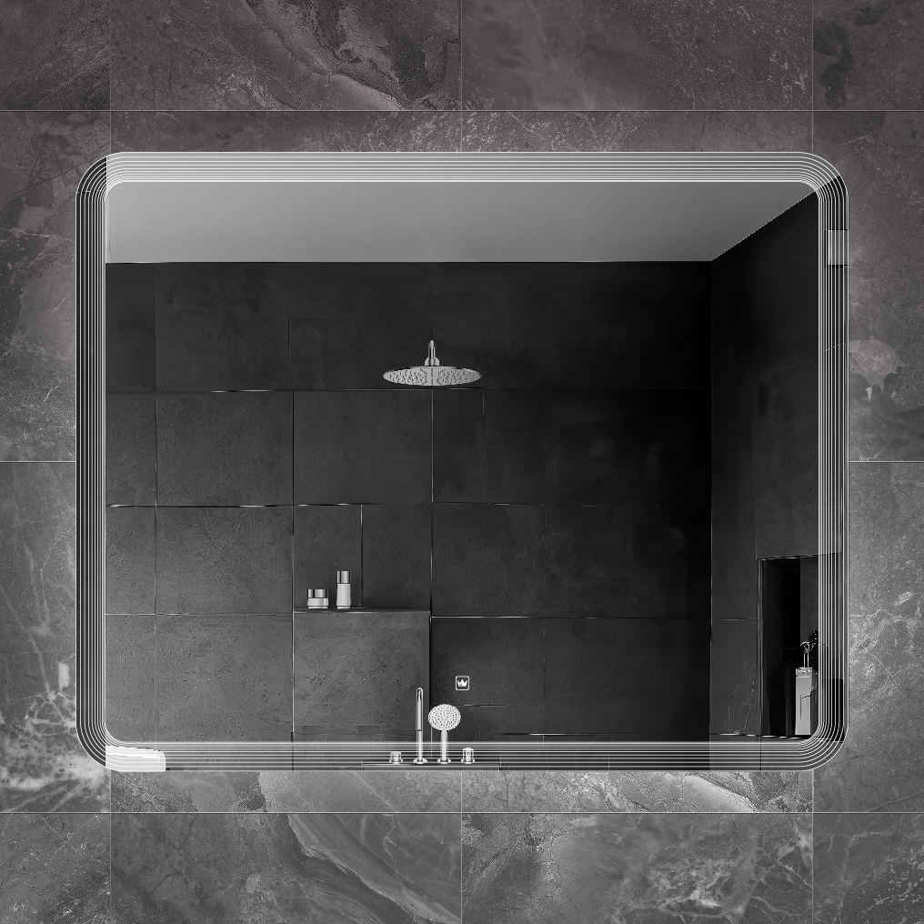 Зеркало 100×80 прямоугольное с сенсорным выключателем на прикосновение и лазерной гравировкой по периметру. Корпус изделия выполнен из пластика. Cветодиодная лента установлена снаружи корпуса в силиконовой оболочке(повышенной влагостокости). Диммер с возможностью регулировки яркости свечения. Лента SMD 3528, IP 44, 12V, 4200 К, холодный свет. Навесы имеют регулировку по горизонтали 1.5 см. Крепеж для монтажа прилагается.