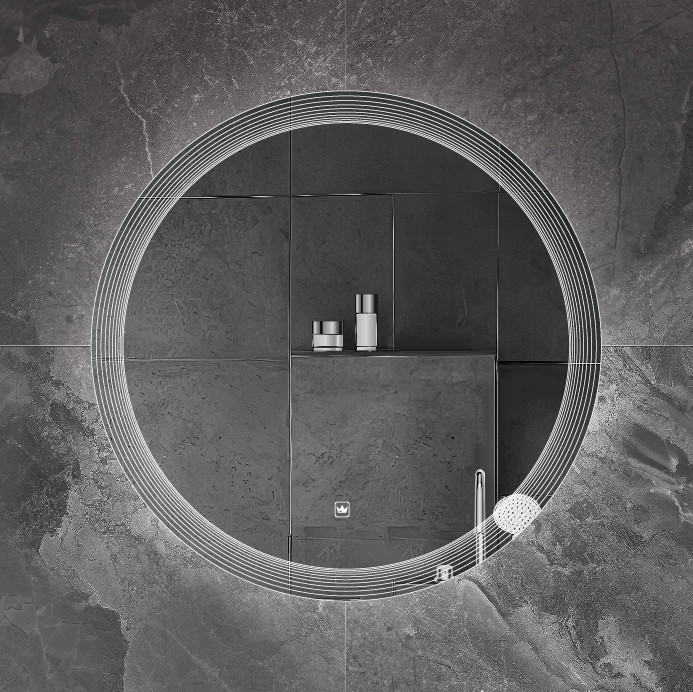 Зеркало 60×3 круглое с сенсорным выключателем на прикосновение и лазерной гравировкой по периметру. Корпус изделия выполнен из пластика. Cветодиодная лента установлена снаружи корпуса в силиконовой оболочке(повышенной влагостокости). Диммер с возможностью регулировки яркости свечения. Лента SMD 3528, IP 44, 12V, 4200 К, холодный свет. Навесы имеют регулировку по горизонтали 1.5 см. Крепеж для монтажа прилагается.