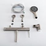 •В комплекте со смесителем: 3-х душевая лейка из ABS-пластика, душевой шланг PVC 150 см, поворотный держатель душевой лейки