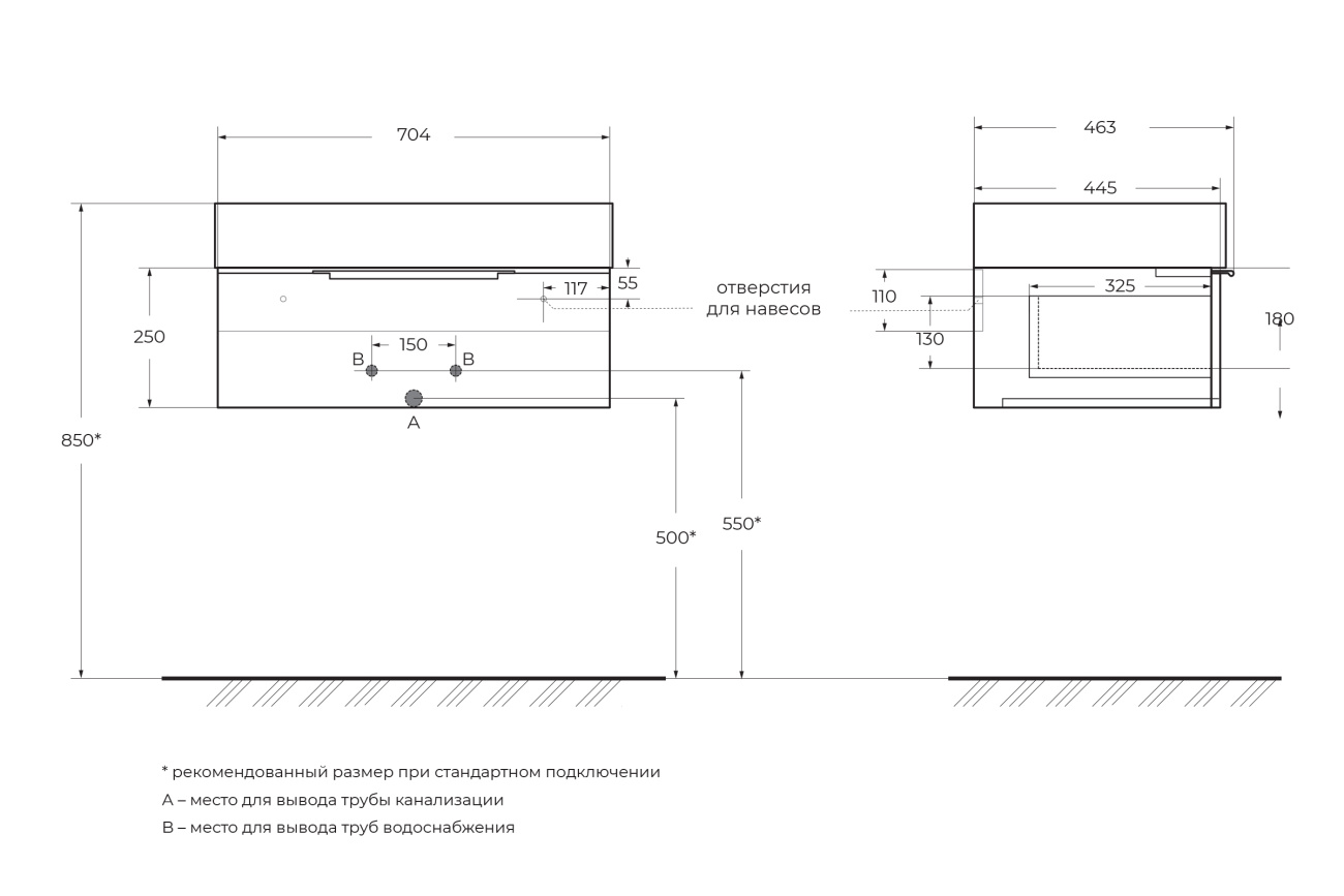 Комплект поставки: • Тумба • Раковина с декоративной накладкой на отверстие перелива в цвете хром, 1 отверстие под смеситель,