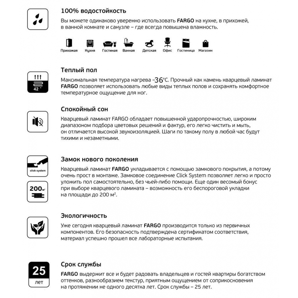 - Твердый пол. Кварцевый ламинат Fargo по плотности близок к керамограниту — 2100 кг/м3. Благодаря этому напольное покрытие обладает уникальной ударостойкостью и прочностью.