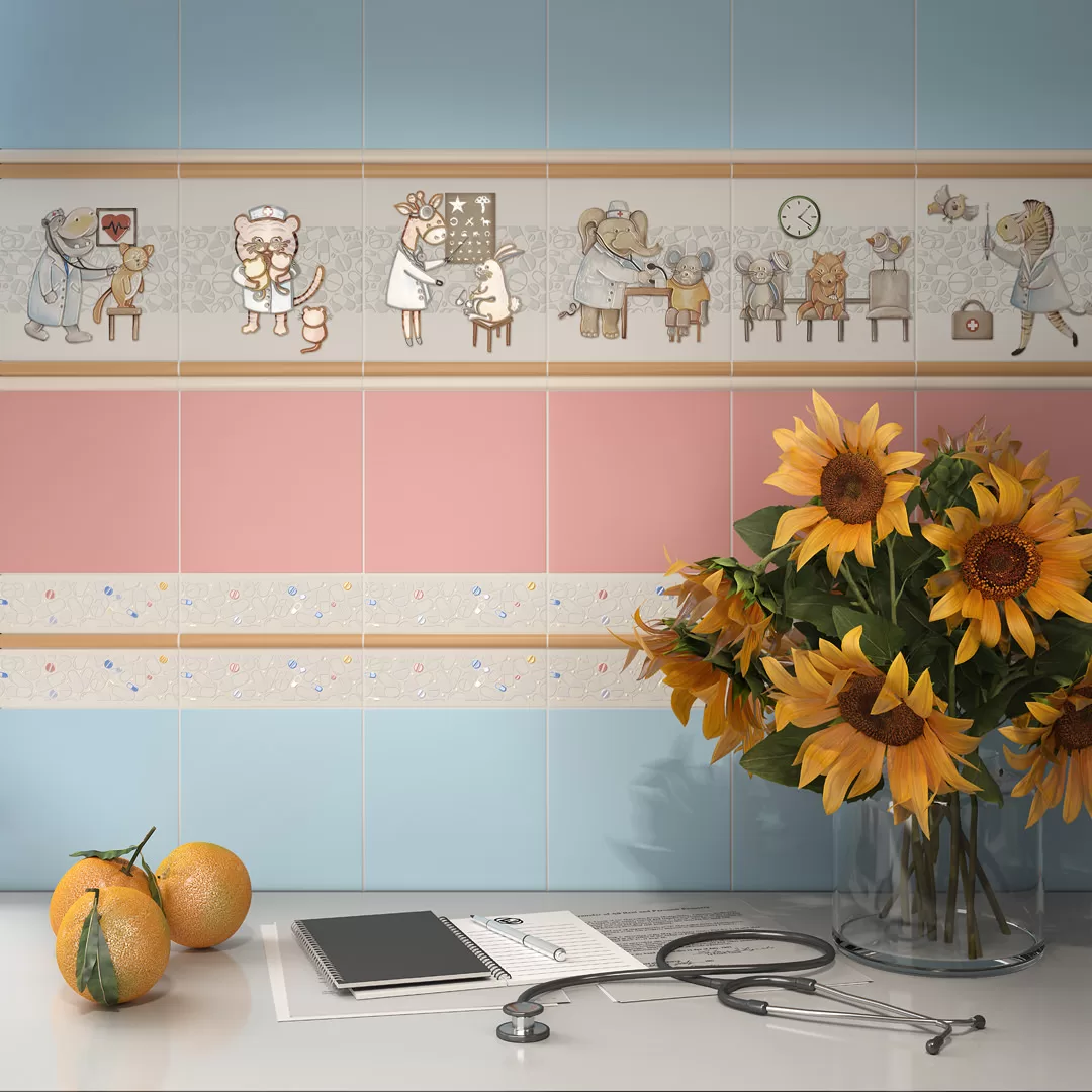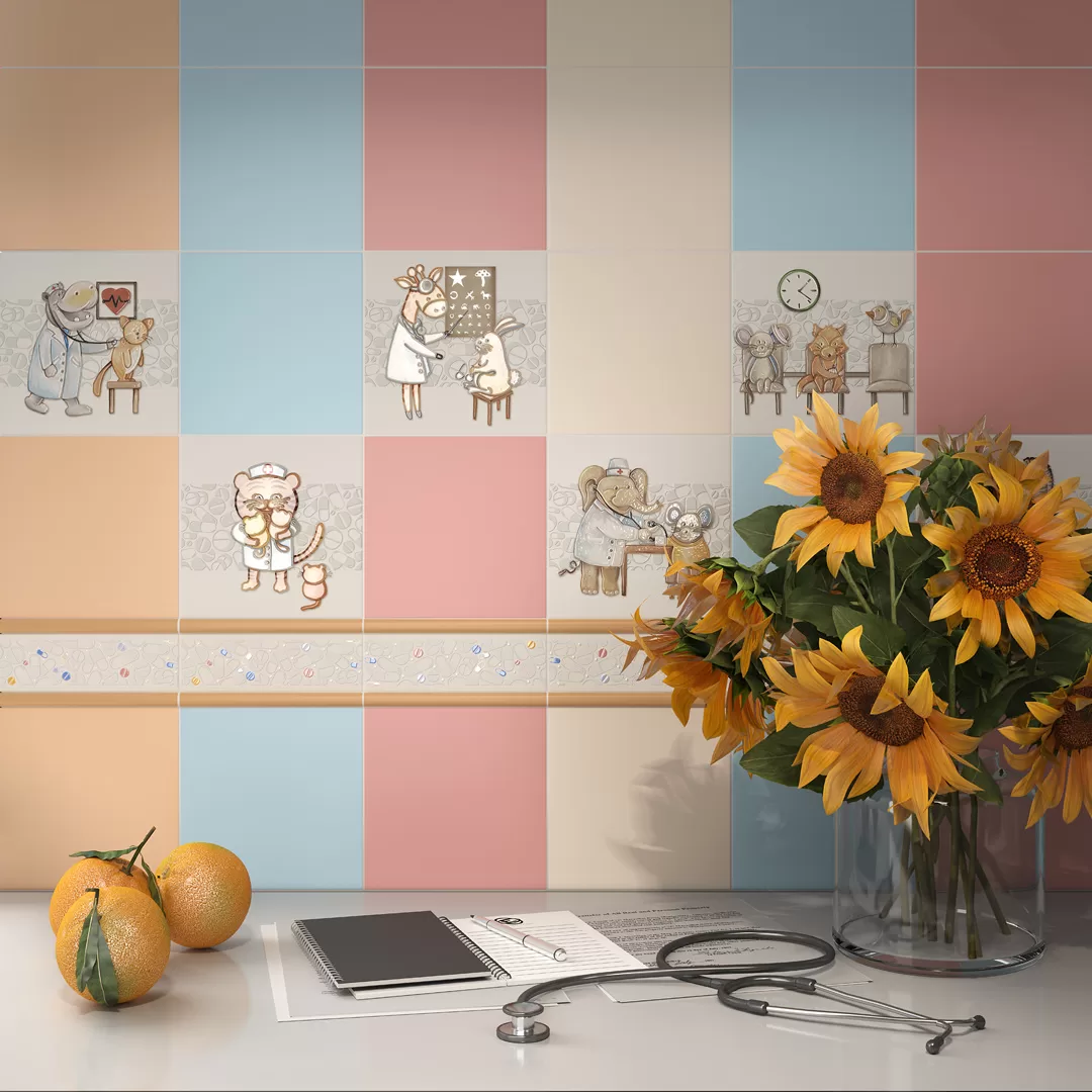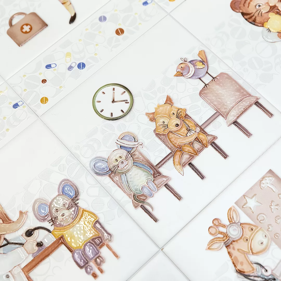 Шесть рисованных сюжетов отлично дополнят фоновую плитку в семейной клинике или детском медучреждении. Для придания изображениям дополнительного блеска и объёма использован прозрачный состав, создающий поверх рисунка толстый слой глазури.
