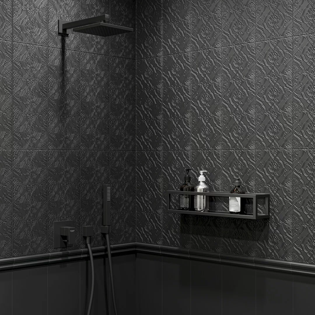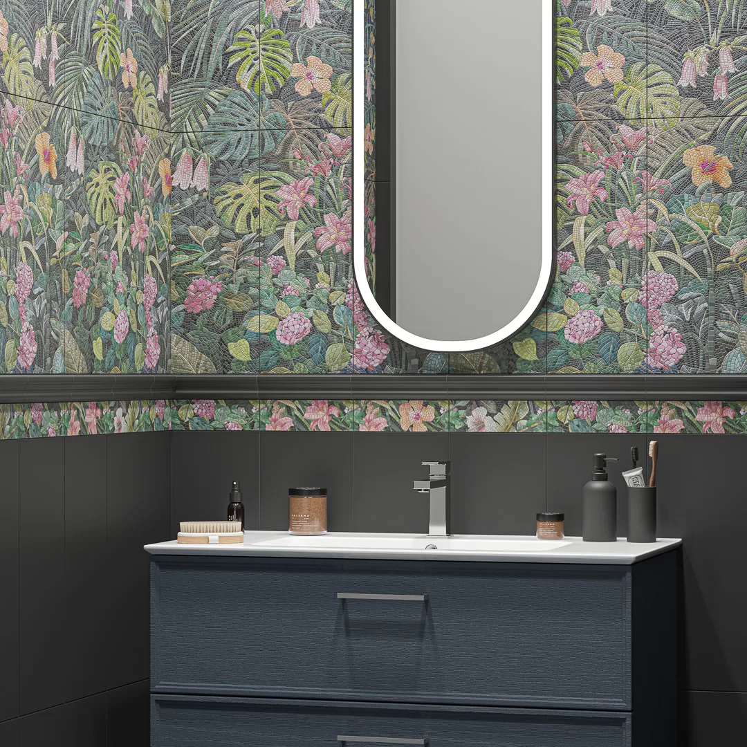 Плитка 20×50 см серии «Альвао» подразумевает бесшовную укладку, дополняющую реалистичность восприятия цветочного рисунка. Благодаря лёгкому глянцу керамической плитки под мозаику свет, особенно направленный, рождает эффект блестящей поверхности. Бордюр с цветочным рисунком, точь-в-точь как на панно из плитки, позволит создать нужные акценты: например, оформить зеркало, дополнительно выделить край ванны или мебели. Цветные бордюры и различные оттенки бордюра-бисера открывают новые горизонты в декорировании помещения.