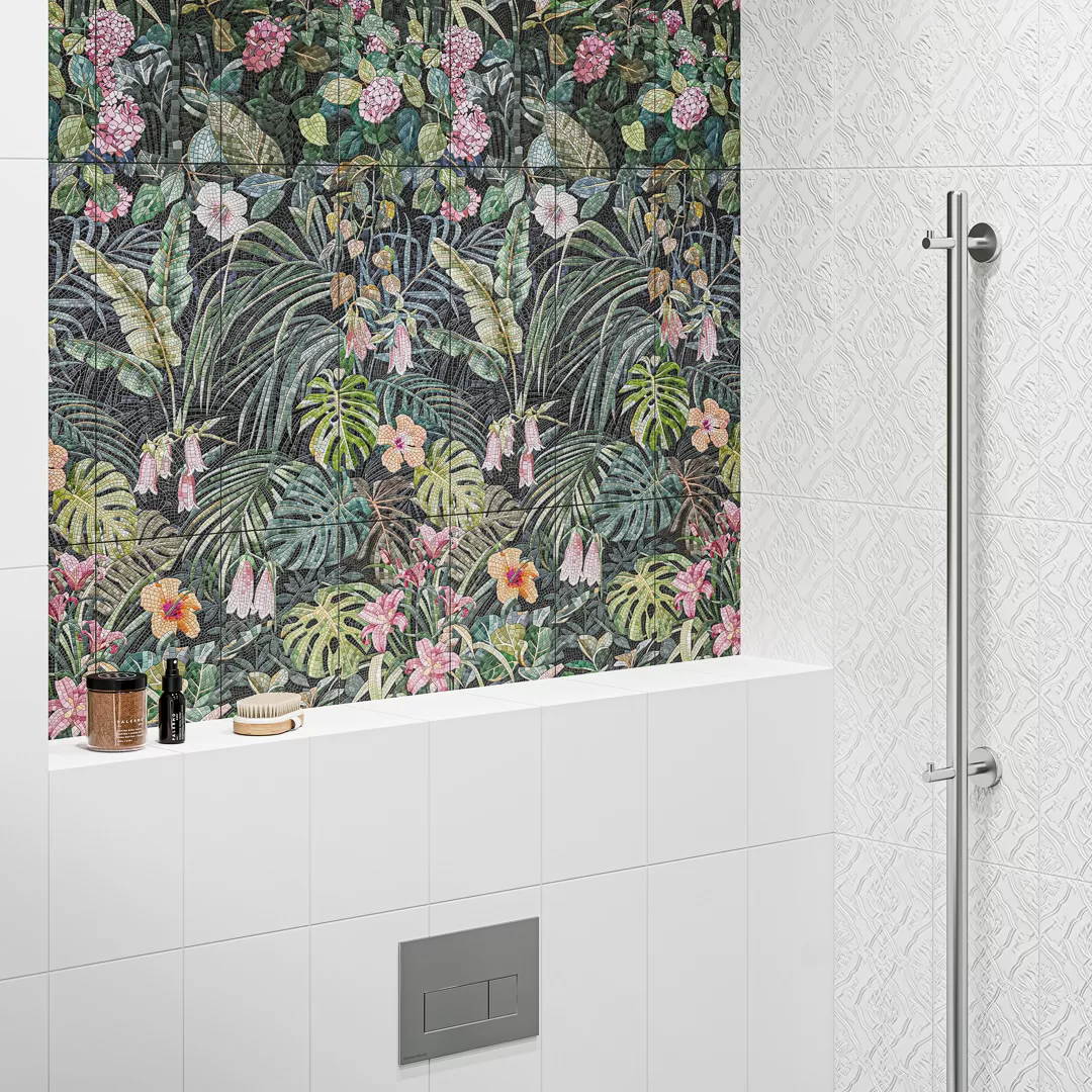 Эксклюзивное предложение серии «Альвао» — флористическое панно из плитки с эффектом художественной мозаики. Россыпь дивных цветов на фоне пышной зелени образуют панно из шести частей 20×50 см. Рисунок составлен таким образом, что верхний и правый края можно продолжить и сделать панно любого необходимого размера. Дополнить отделку предлагается белой либо черной матовой плиткой. Фон можно выбрать гладким или с орнаментальной структурой флористического дизайна.