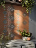 Особая эстетическая ценность этой серии мозаичной плитки — в декоративных элементах двух видов. Штучные декоры содержат растительный узор в золотистой гамме, а два набора декоративных вставок, выдержанных в глубоких сине-зелёных и бежевых тонах, украшены перламутровым составом. Такие керамические акценты, вписанные в основное покрытие, будут уместны не только в интерьере в восточном стиле, но и в современной обстановке в духе фьюжн.