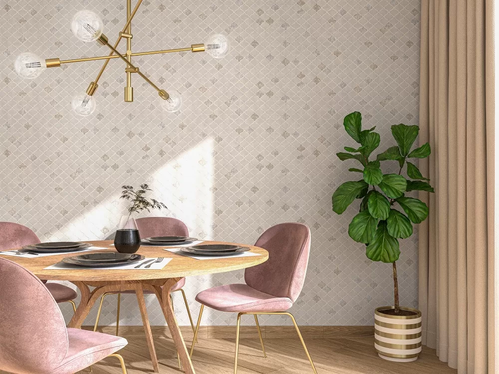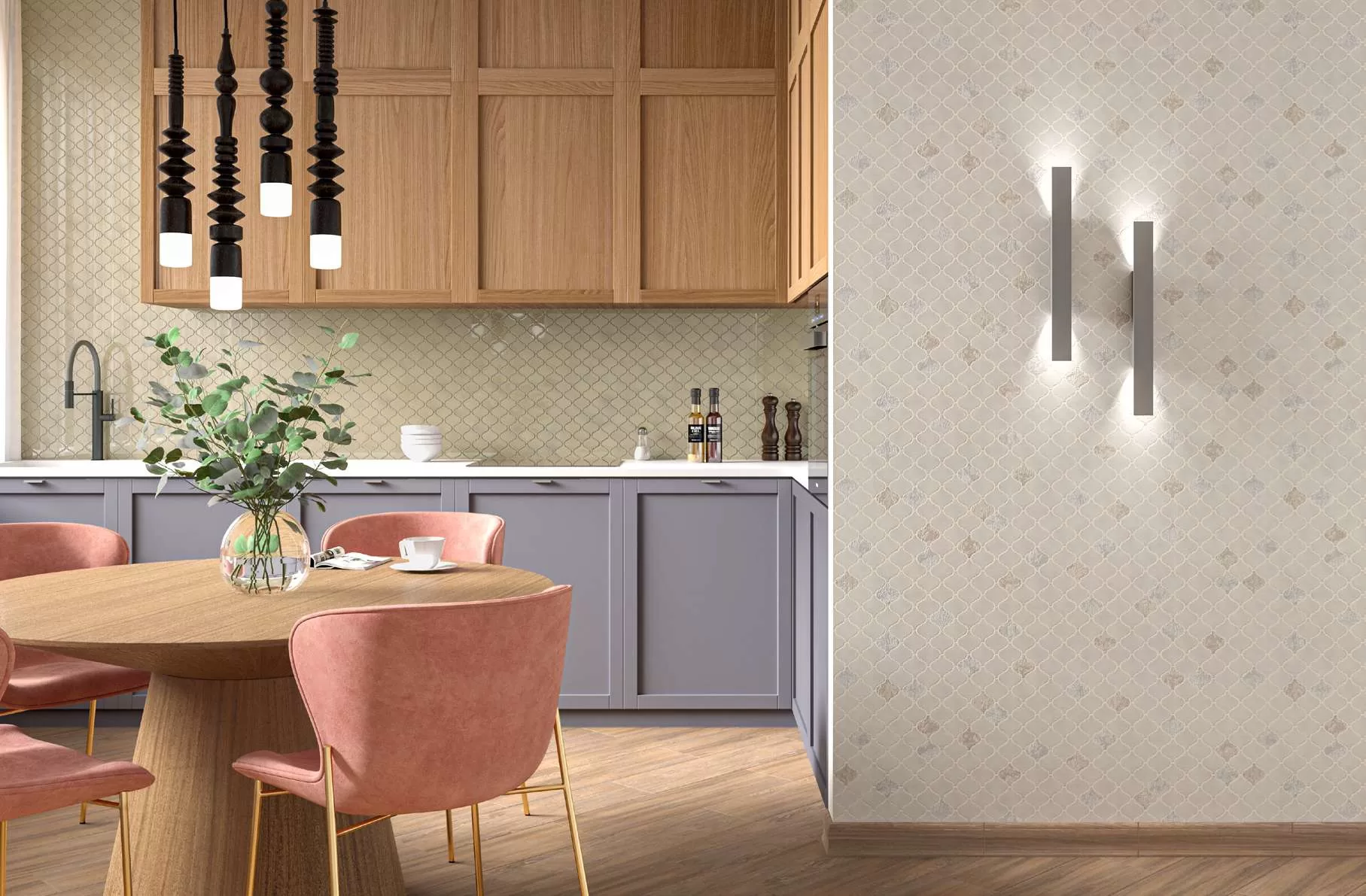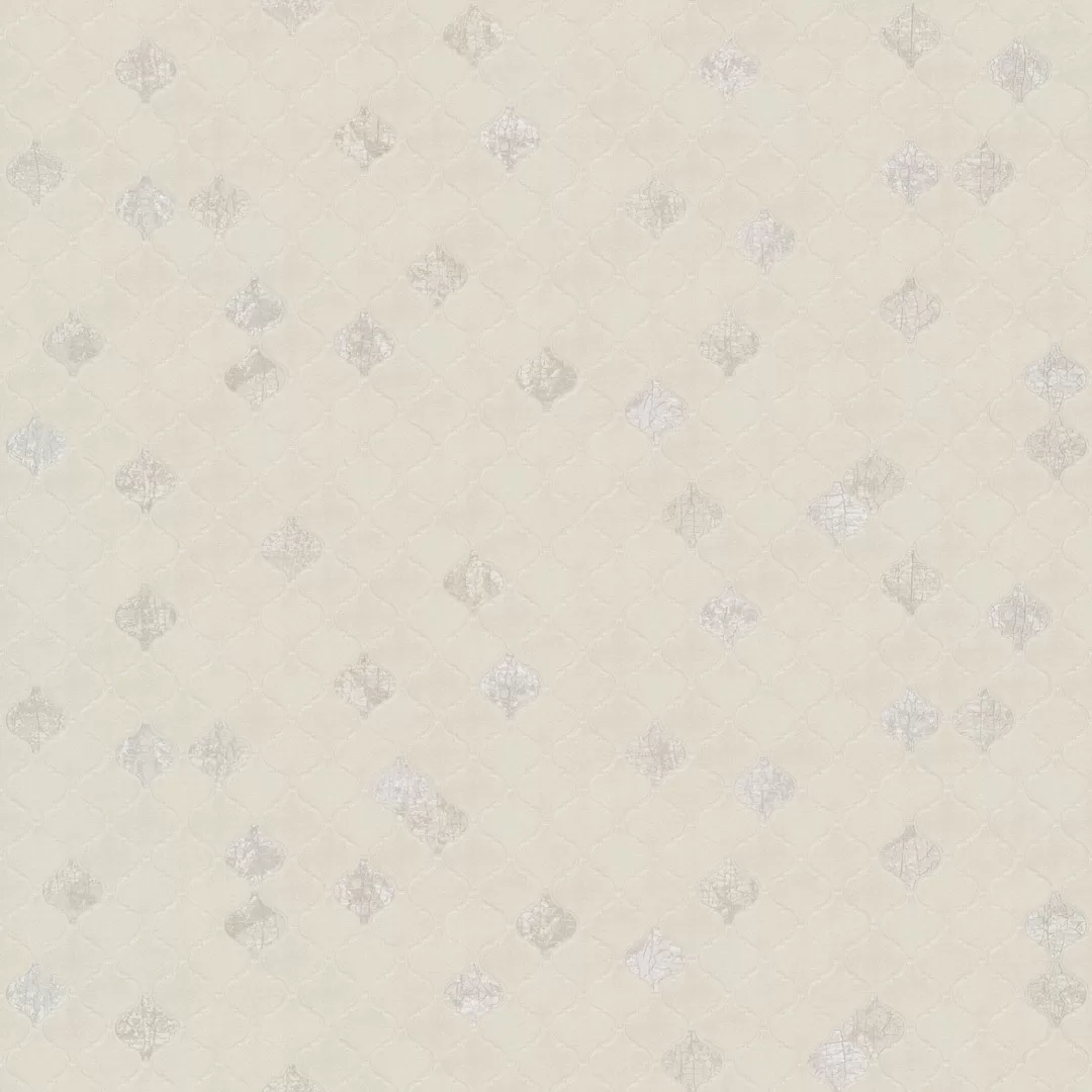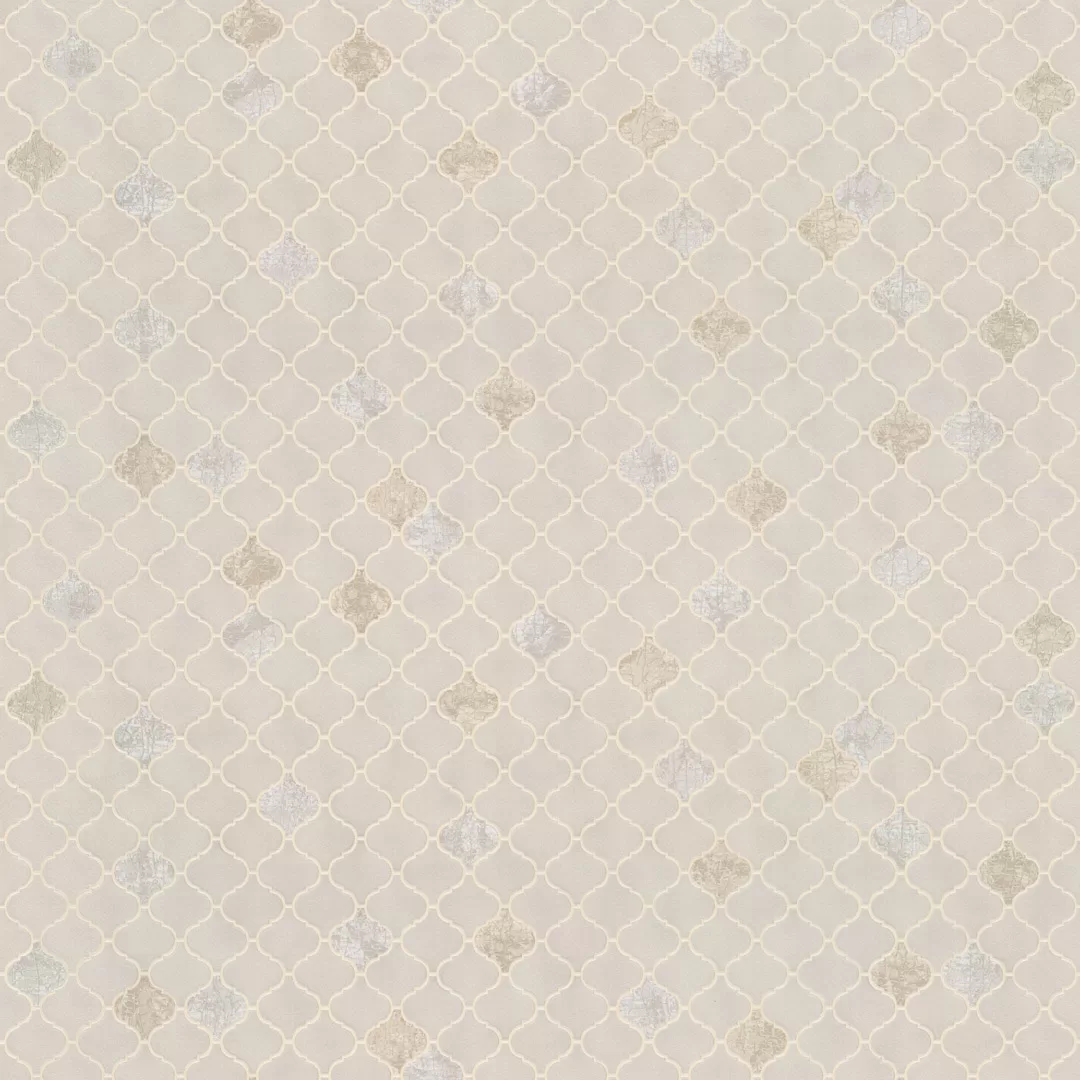 Арабески, заслужившие любовь в керамической мозаике, теперь доступны и в варианте обоев. В некоторых элементах узора заметен эффект кракле — краска словно потрескалась от времени.