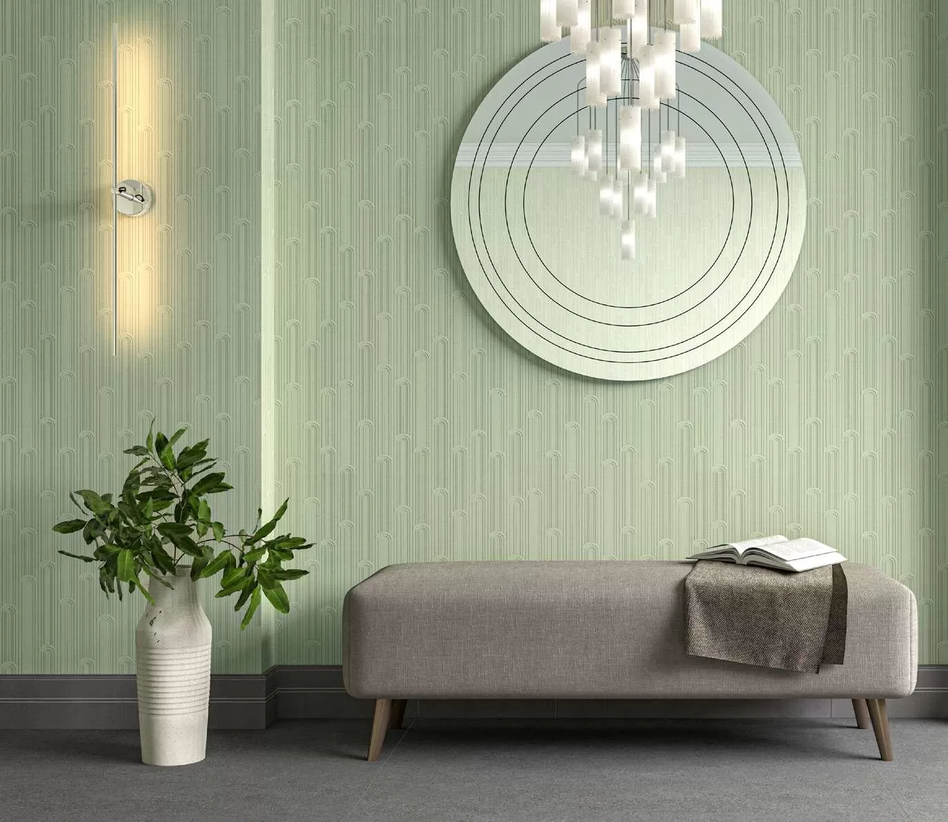 Арка — истинно миланский символ, который не раз возникает в керамической коллекции Milano. В обоях эта форма объединяет в один модный паттерн два популярных элемента: вертикальные полоски и дуги.