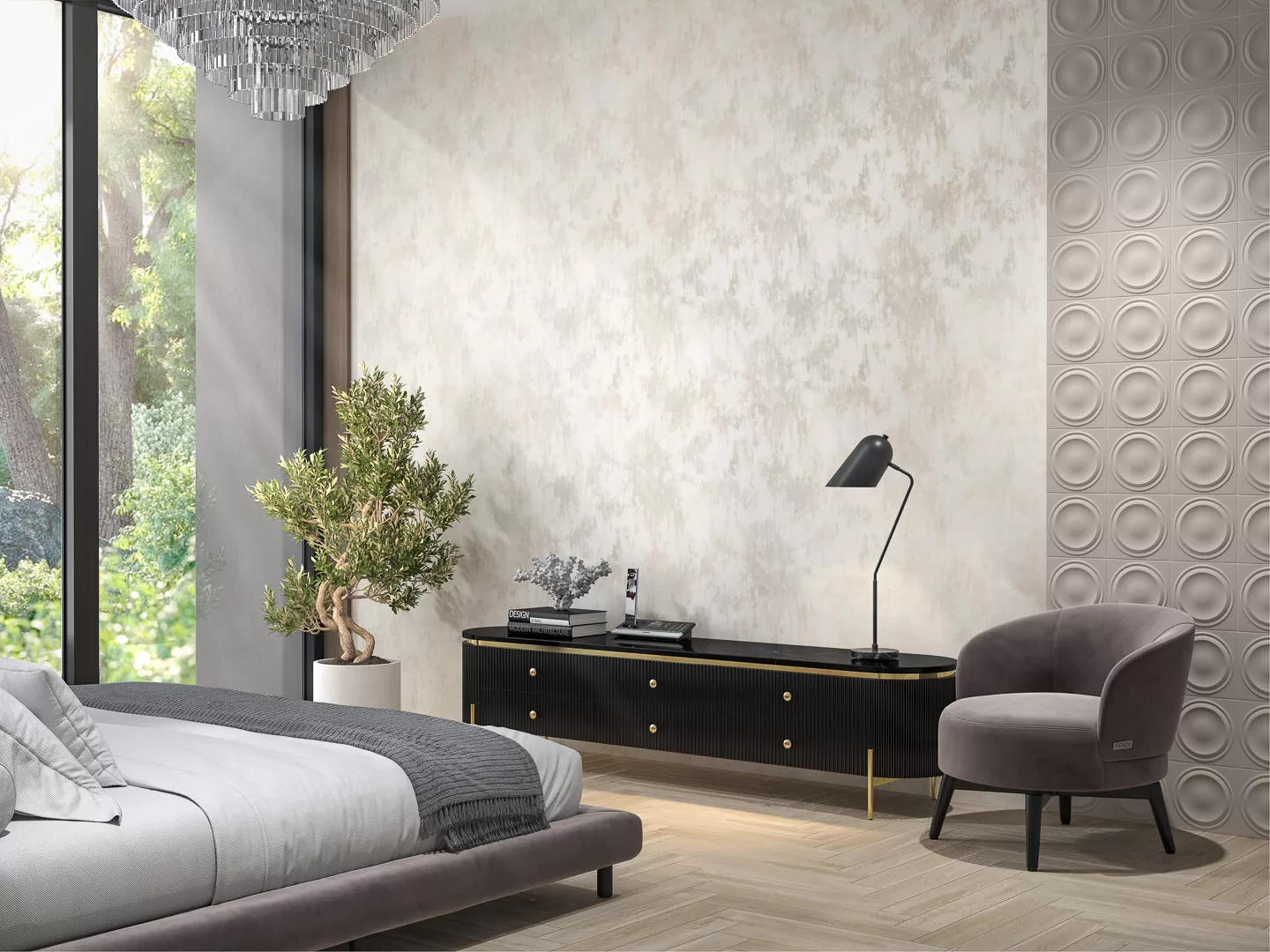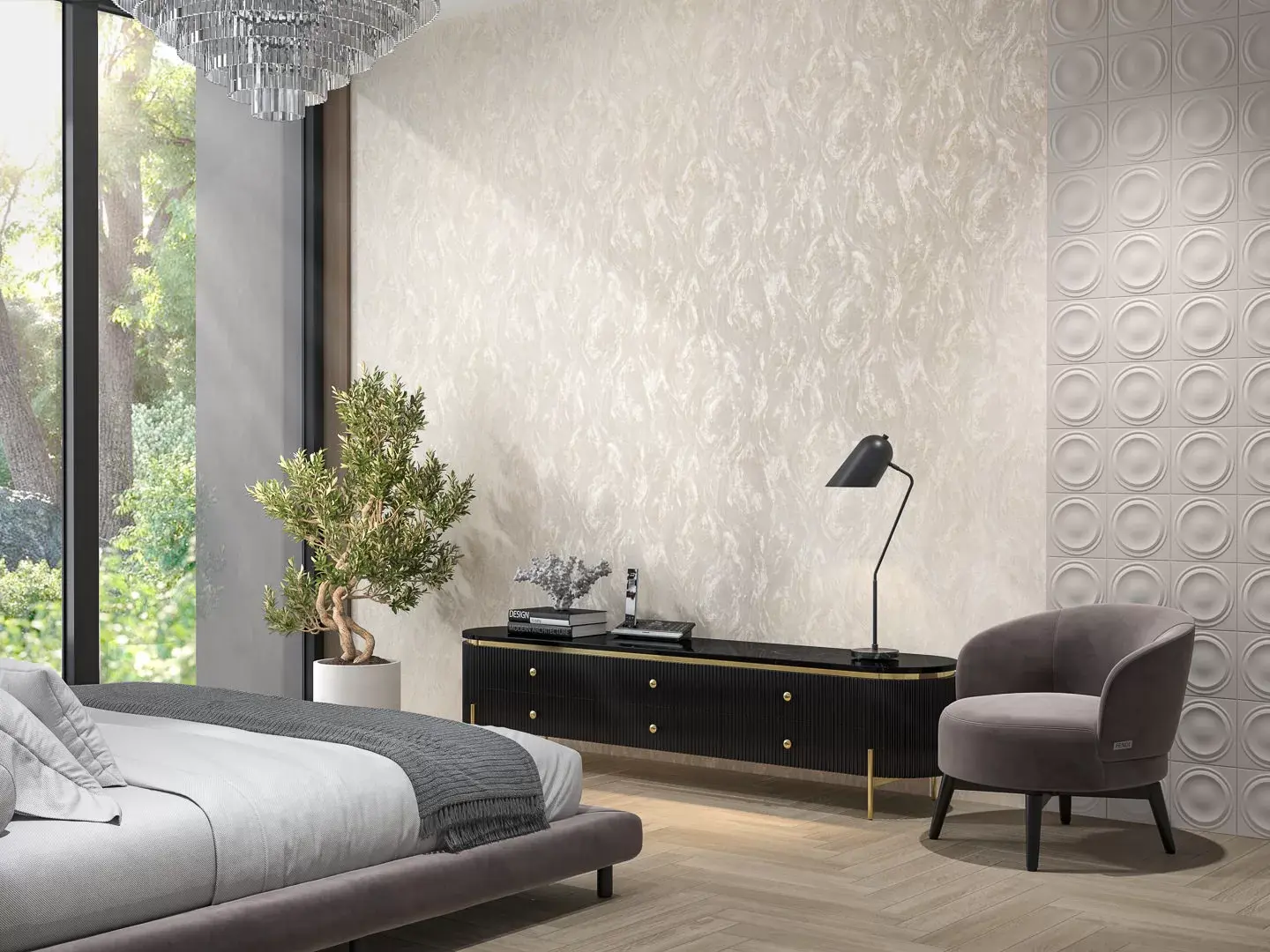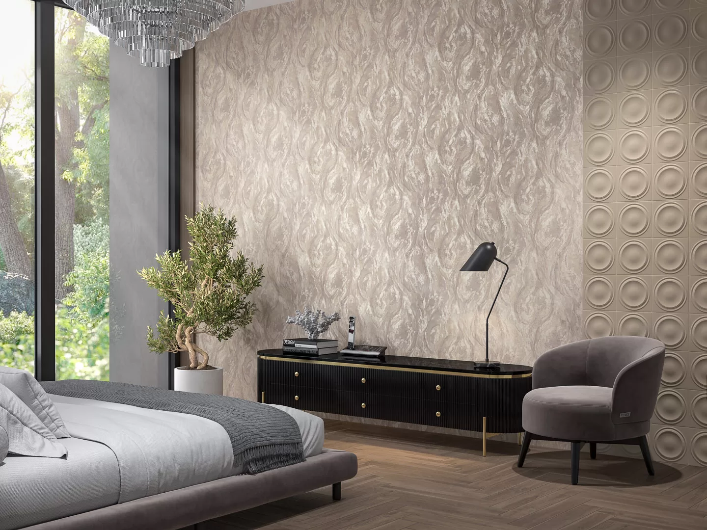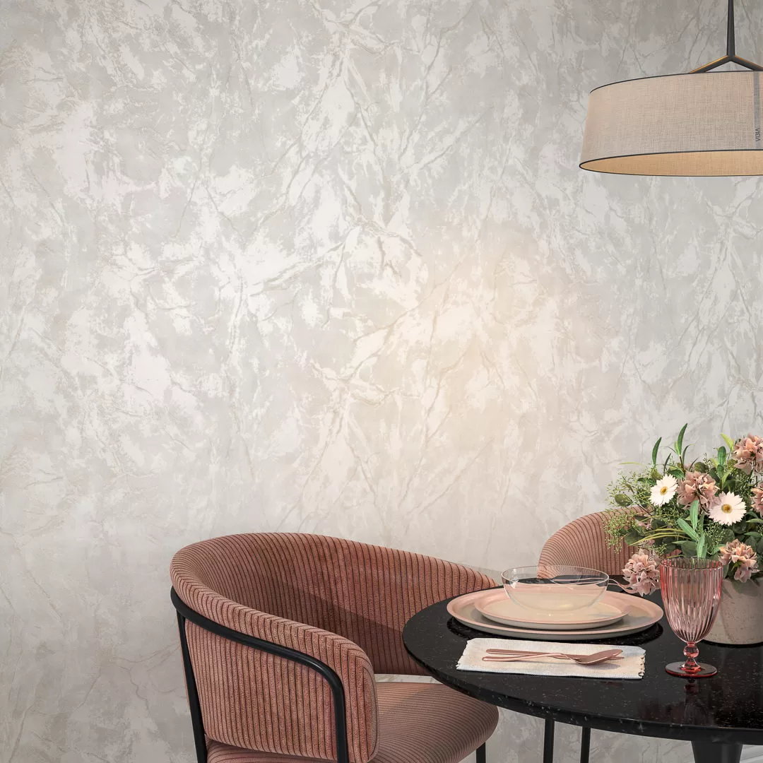 Обои с текстурой мрамора вдохновлены красотой слэбов из карьеров Каррары. Все артикулы выполнены в светлых тонах, от белого к бежевому и серому, на котором контрастно видны более тёмные прожилки. На матовой поверхности заметно тиснение, помогающее проявить рисунок, сделать его более насыщенным.