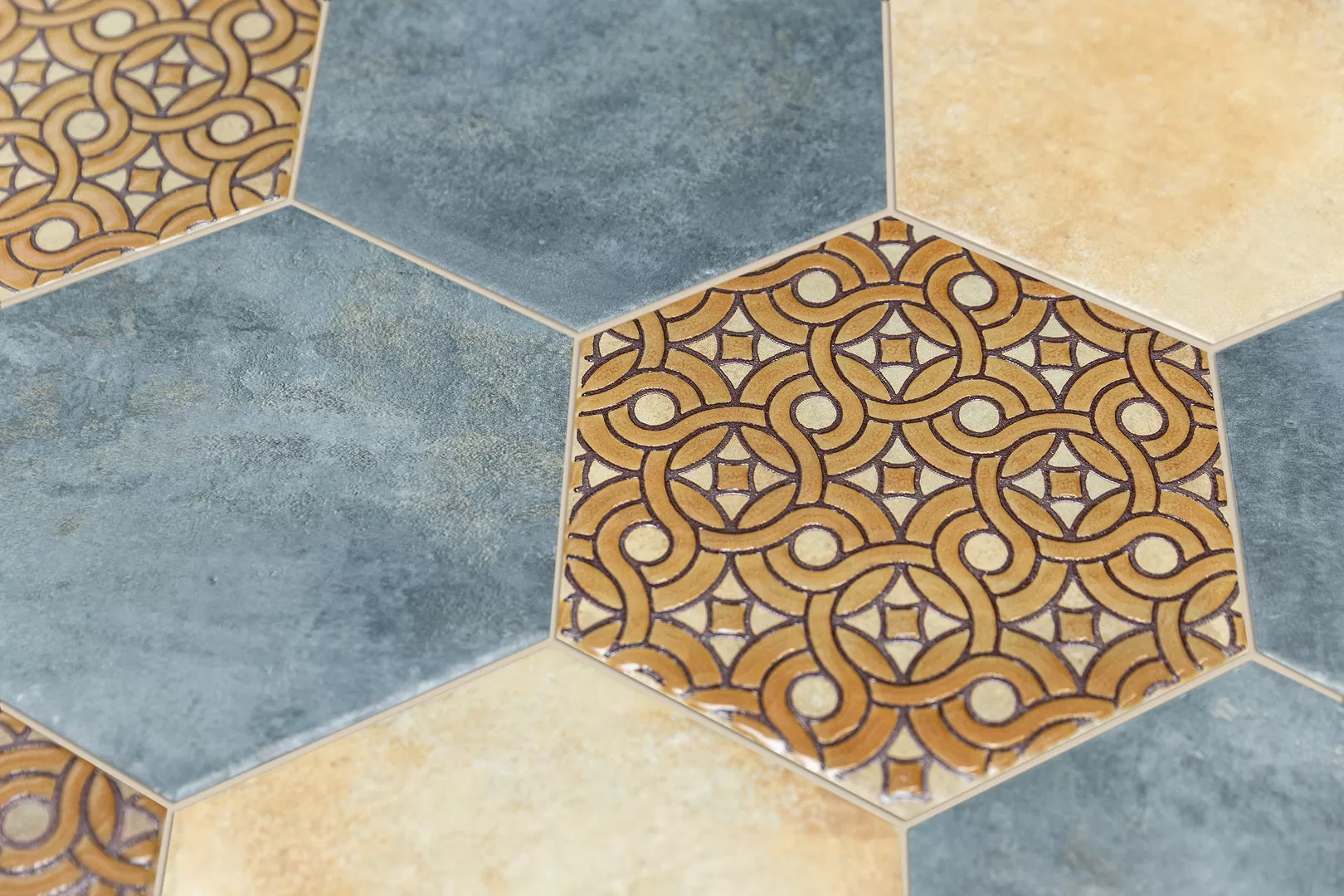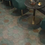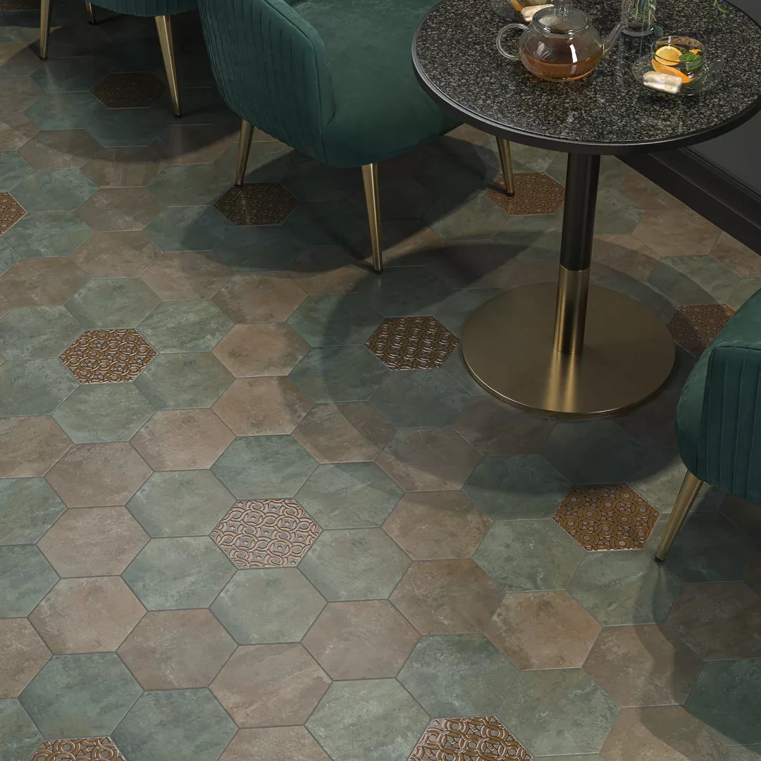 В серии представлен шестиугольный керамогранит с покрытием, которое предлагает моноколор в варианте «котто» — с неравномерным матовым цветом. Цифровая печать выполнена с добавлением блестящих чернил, что делает керамическое покрытие визуально ещё более интересным. Такое можно легко представить себе в качестве керамогранита для кухни, прихожей или летней веранды.