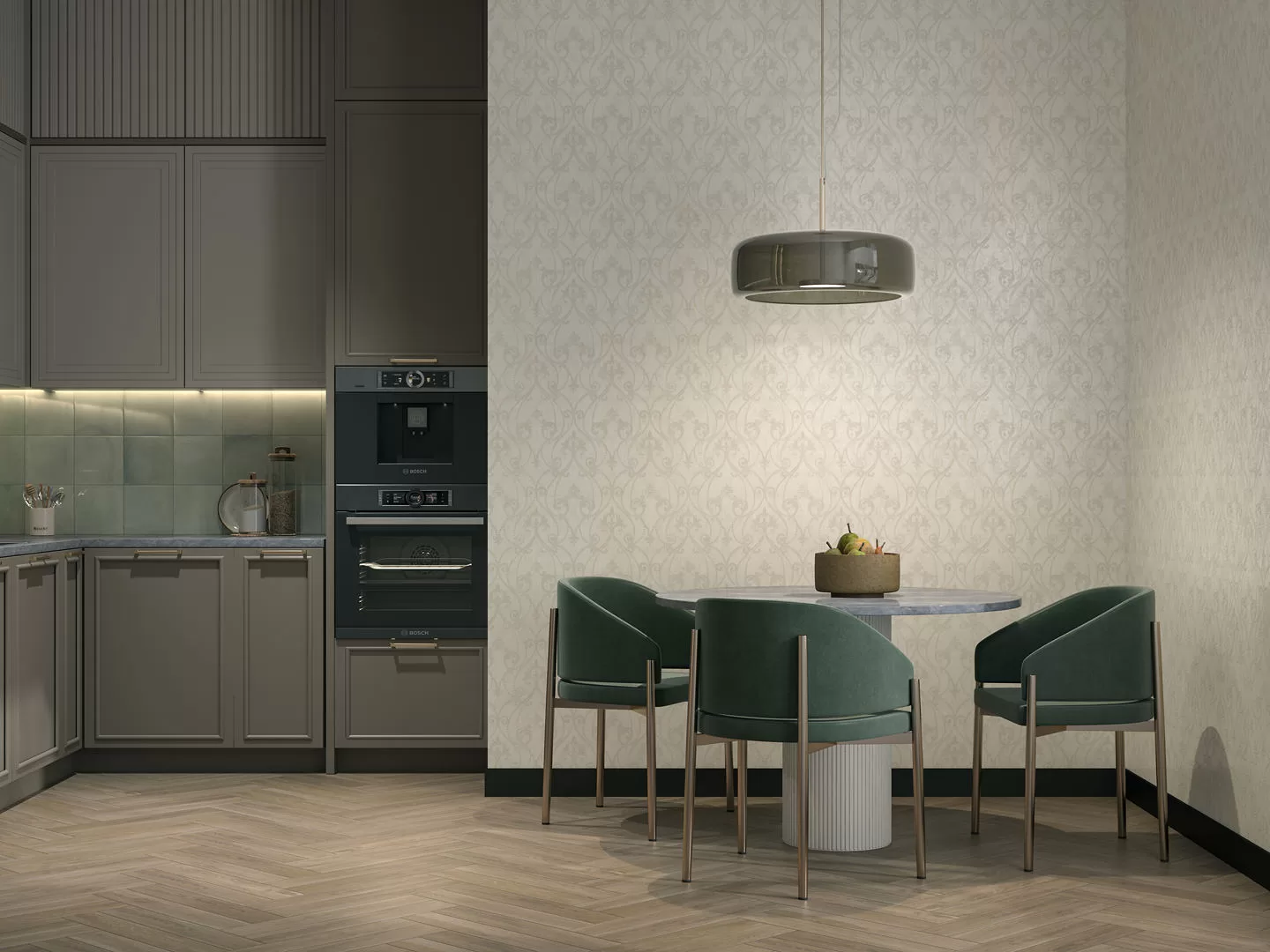 Данная серия виниловых обоев для стен обращается к дамасскому узору. На сегодняшний день это, пожалуй, самый популярный растительный орнамент в интерьерном дизайне. Флористический паттерн с повторяющимся геометрическим рисунком стал известен в Европе ещё в средние века, и с тех пор активно используется в обстановке.