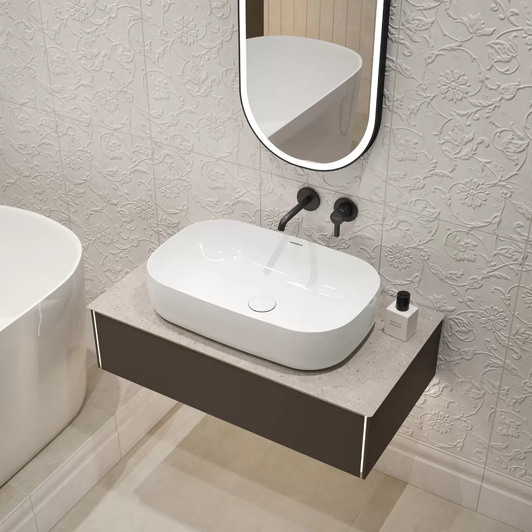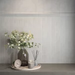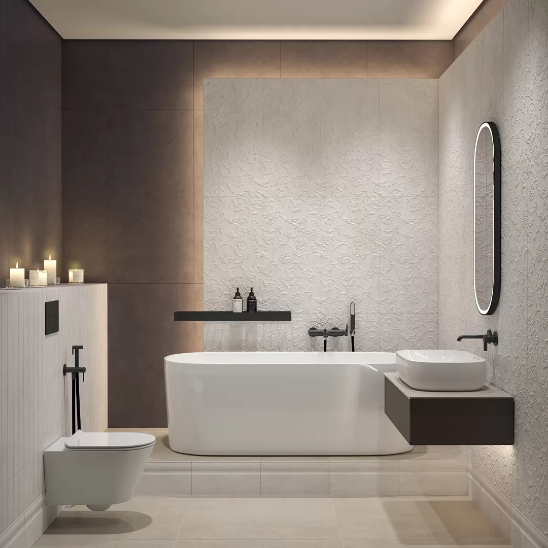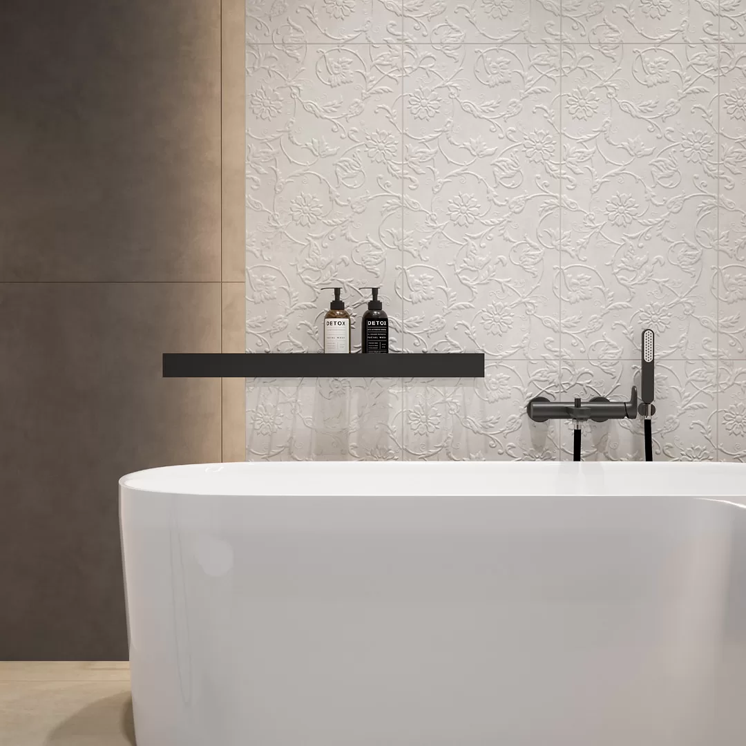 Базовая прямоугольная плитка формата 40×80 представлена как с гладкой, так и со структурированной поверхностью, украшенной цветочным орнаментом. Такой артикул будет удобен в том числе для интерьеров в стиле лофт и контемпорари, где в текстуре бетона могут быть выполнены выкладки большой площади. В декорах использован трендовый приём — плитка с преднарезкой, которая готова составить конкуренцию крупной мозаике.