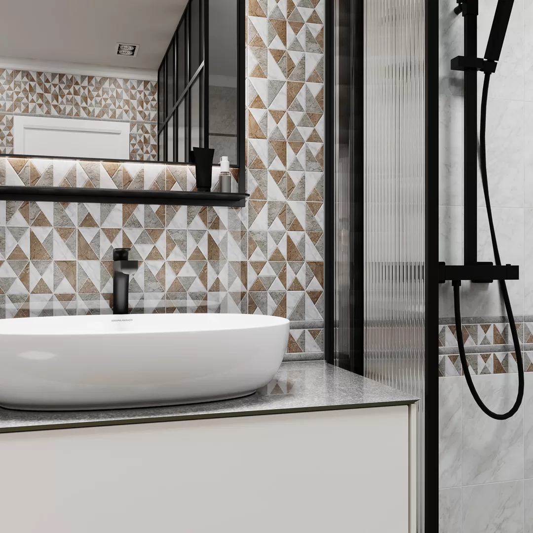 Основную палитру фоновой плитки поддерживают цвета геометрического рисунка на декорах «Каприччо». Благодаря тонкому контуру, повторяющему линии орнамента, на них проявляется эффект объёма.