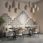 Разнообразить керамическую выкладку можно с помощью декоров. Самый крупный из них также имеет размер 60×119,5 см. Рисунок с эффектом мозаики, покрытый защитным слоем, сделан так, чтобы дать возможность продолжить композицию по горизонтали и вертикали.