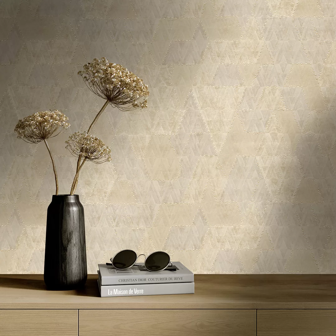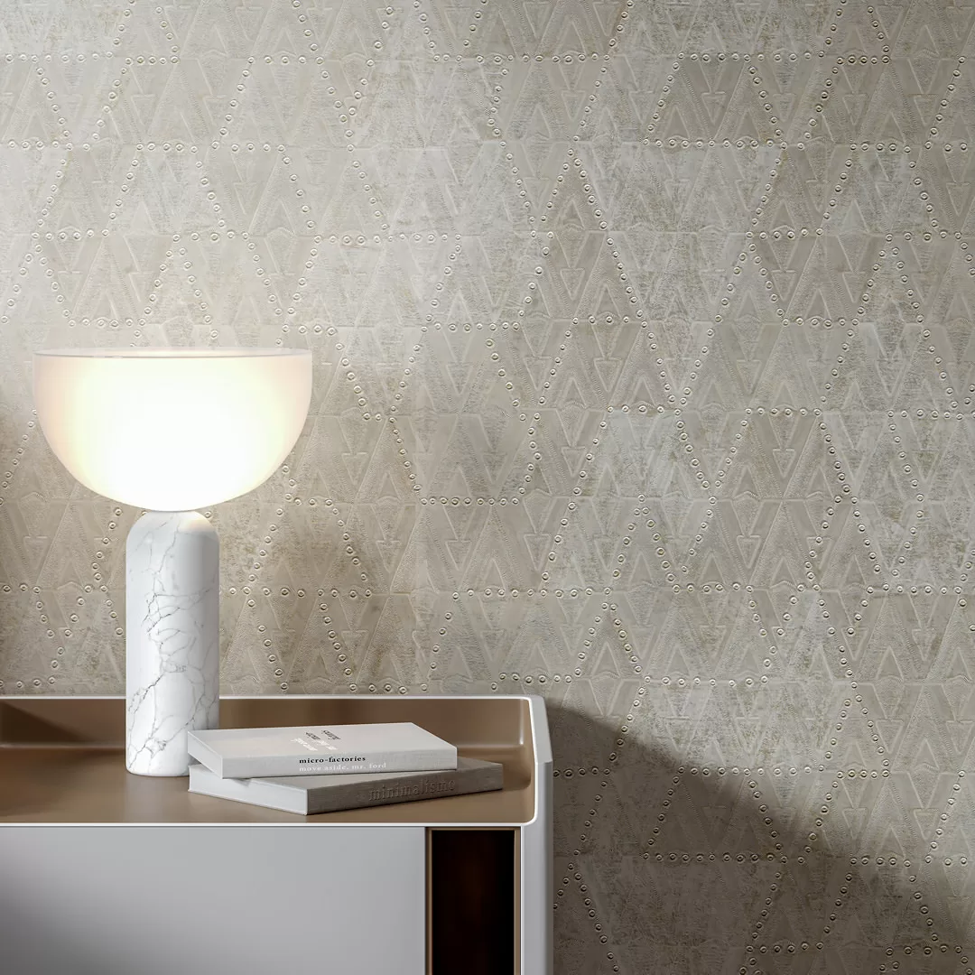 Эффект металлического блеска достигнут за счёт применения перламутра на более светлых рулонах и золота — на мотивах с более глубоким цветом. Тиснение придаёт покрытию объём и делает стильный геометрический рисунок по-настоящему выразительным.