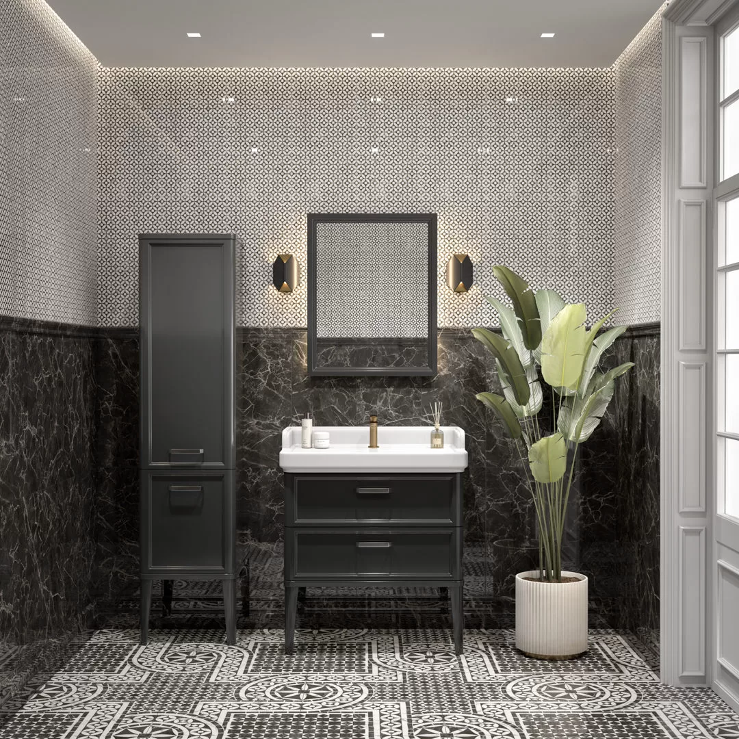 Контраст чёрного и белого мрамора — беспроигрышный вариант для создания обстановки. Ещё одно оригинальное декоративное решение, впервые предложенное в этой серии, — своеобразный «дуэт» плитки с отверстием и совпадающих с ним круглых элементов для включения в композицию собственных наборных декоров.