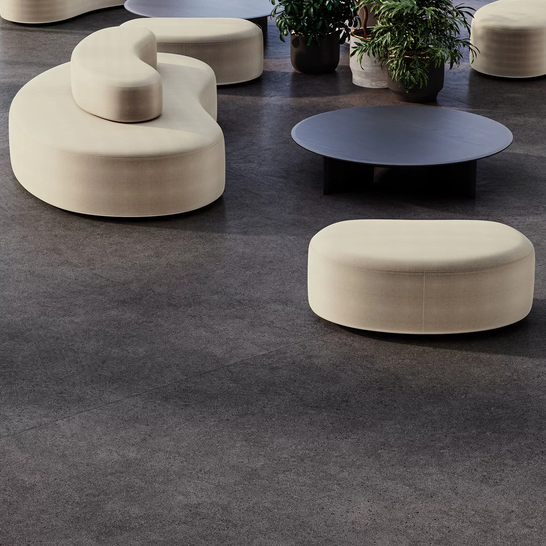 Свойства базальта позволили ему стать одним из самых популярных материалов в строительстве и отделке. Тёмно-серый керамогранит с эстетикой базальта станет отличным решением там, где нужна натуральная матовая поверхность с минимальным количеством стыков. Керамогранит 120×120 см, а также 119,5×320 см воспроизводит базальт «Пьетра Лавика» родом с острова Сицилия. Эта горная порода со склонов вулкана Этна, образовавшаяся в результате извержений, ценится в интерьерной отделке.