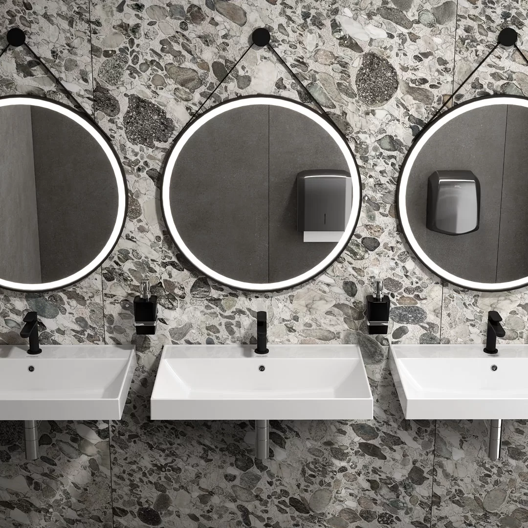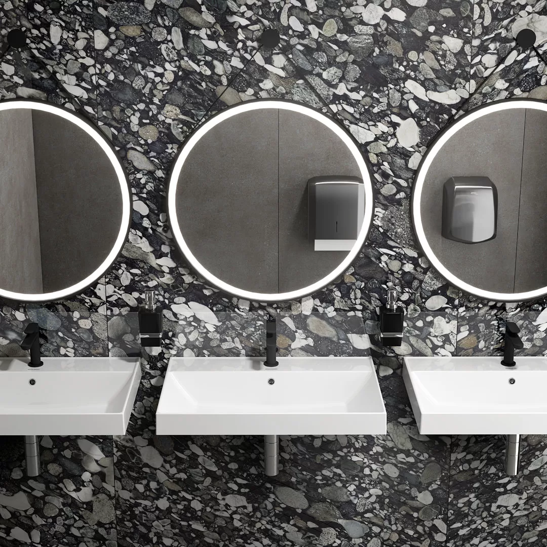 Керамический гранит передаёт выразительную текстуру камня со светлыми и темными вкраплениями.