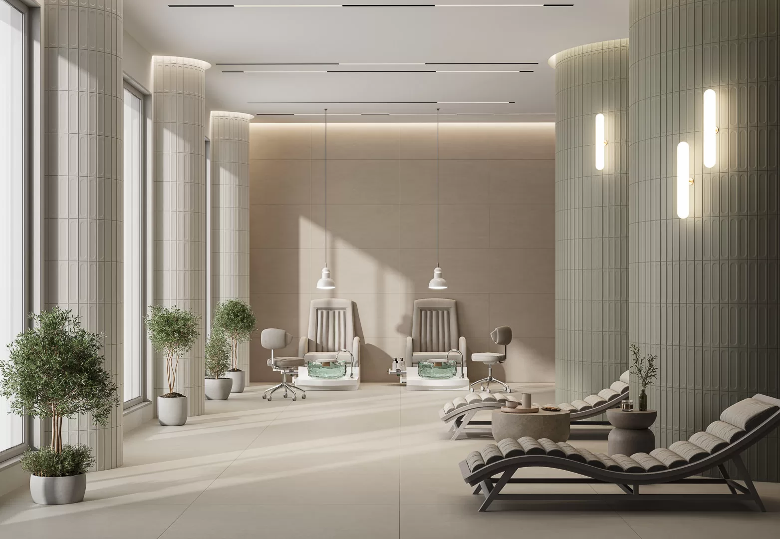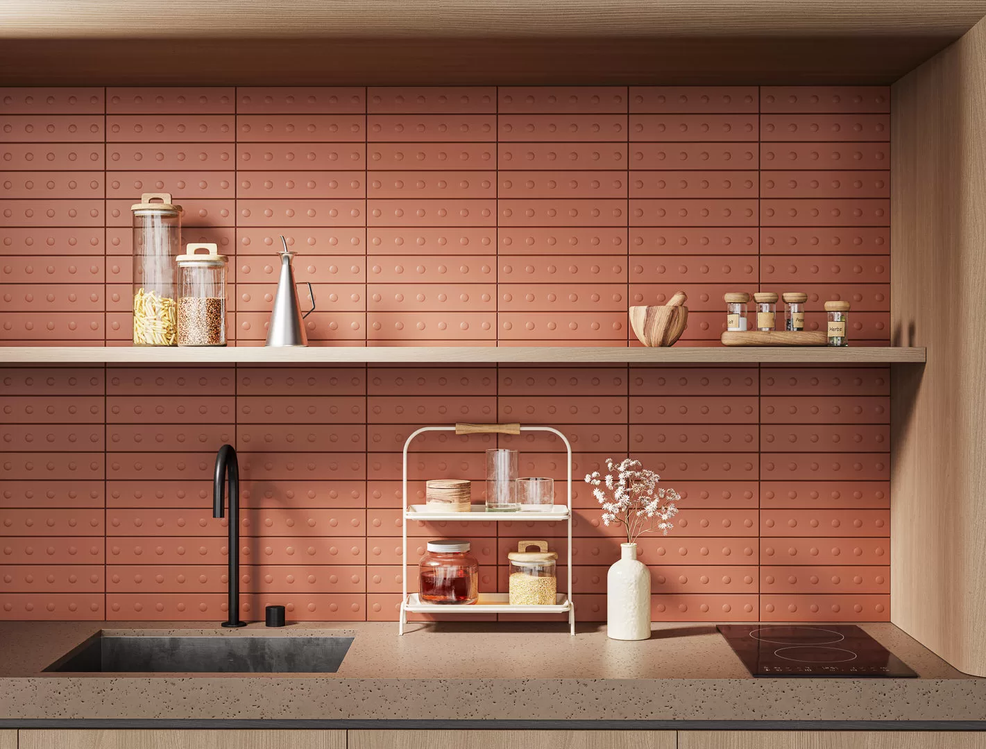 «Медина» предлагает гамму из пяти изысканных цветов, среди которых есть трендовые оттенки: сливочное масло, шалфей, припылённый оранжевый. Матовая поверхность плитки-кирпичика в формате 6×28,5 подчёркивает структуру, придавая отделочным материалам глубину и выразительность. Необычные овальные углубления и ритмичные округлые элементы добавляют керамике выразительность, отражая дух восточной архитектуры.