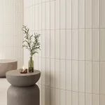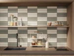 Структура на однотонной плитке состоит из простых геометрических форм: это крупные овалы размером почти во весь формат, а также стильные «клёпки». Такая плитка при разном освещении будет выглядеть по-разному, освежая восприятие керамической композиции.