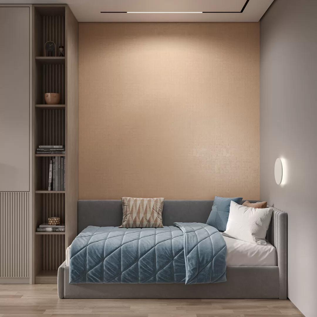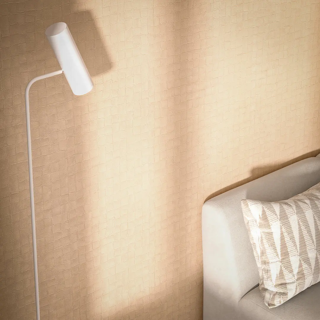 На поверхности обоев присутствует лёгкий геометрический рисунок. Кому-то он напомнит мозаичную выкладку, другие увидят в орнаменте сходство со шкурой рептилии или следами от мастерка, оставшимися после нанесения штукатурки. В любом случае это придаёт таким покрытиям дополнительный шарм.