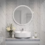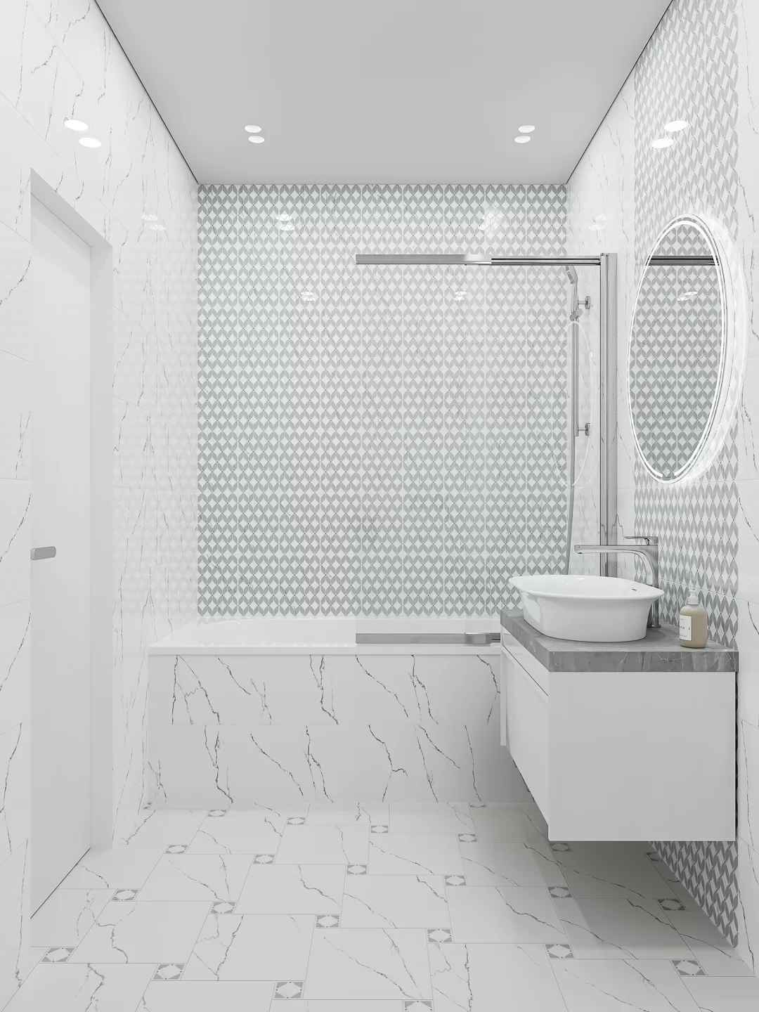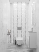 Плитка с рисунком мрамора — действенный инструмент для создания чистых, светлых, при этом нескучных интерьеров. Мозаика, бордюры и карандаши помогут разнообразить универсальную керамическую композицию в белом цвете.