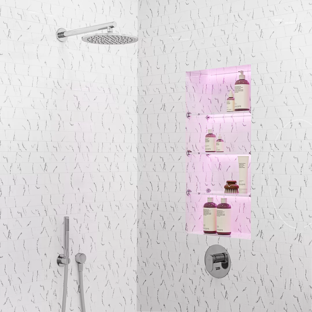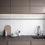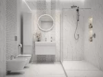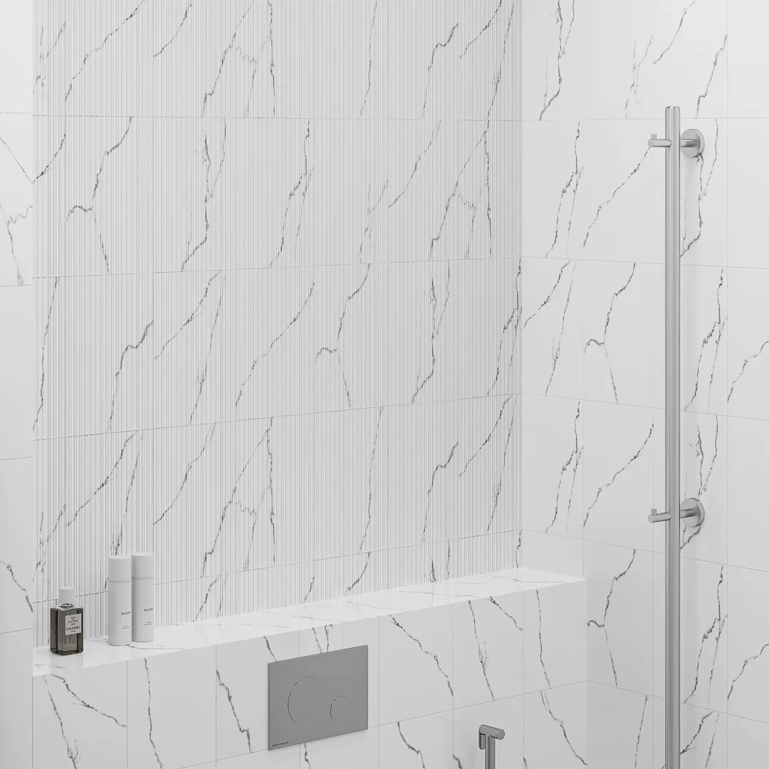 Белые отделочные материалы выглядят особенно стильно, когда белый цвет усилен графикой мрамора и геометрическими узорами. Всё это есть в серии «Мираколи», включая белую глянцевую плитку с востребованной структурой, на которой хорошо читаются частые параллельные полоски.