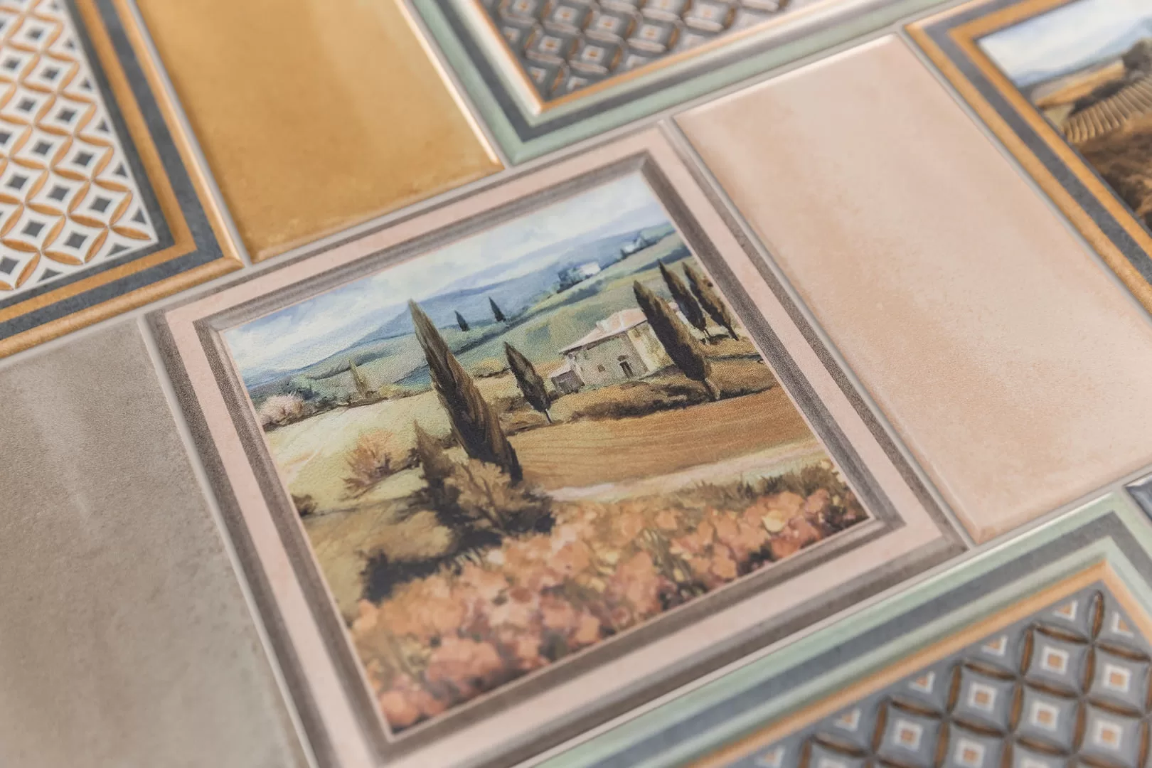 Второй вариант декоров напоминает пейзаж, тоже выполненный со структурой, «обрамляющей» живописные тосканские виды. Эффект влажной кисти позволил получить керамику, будто расписанную вручную итальянским мастером. Такая плитка на кухне точно обогатит отделку, сделает её более индивидуальной.