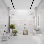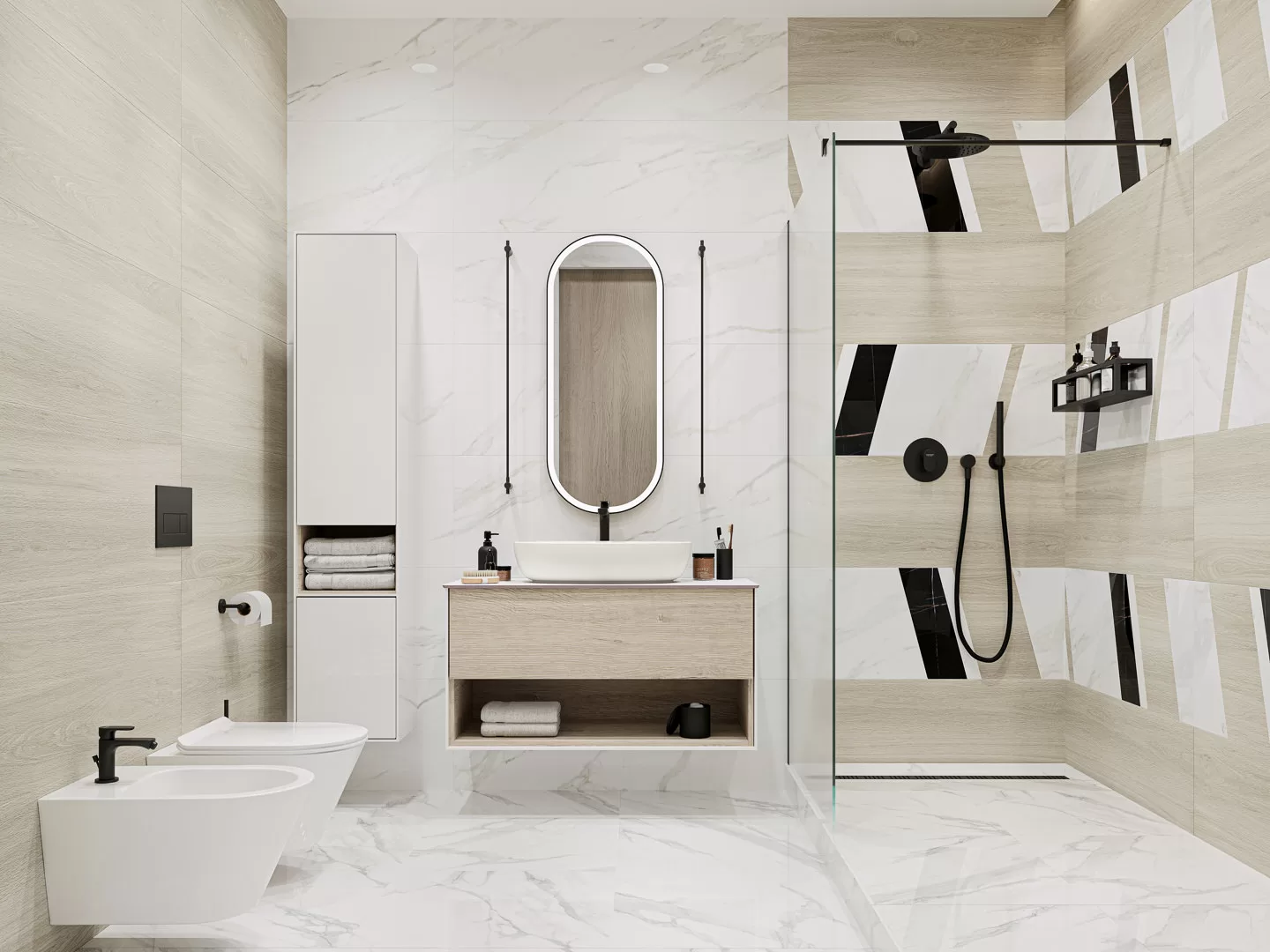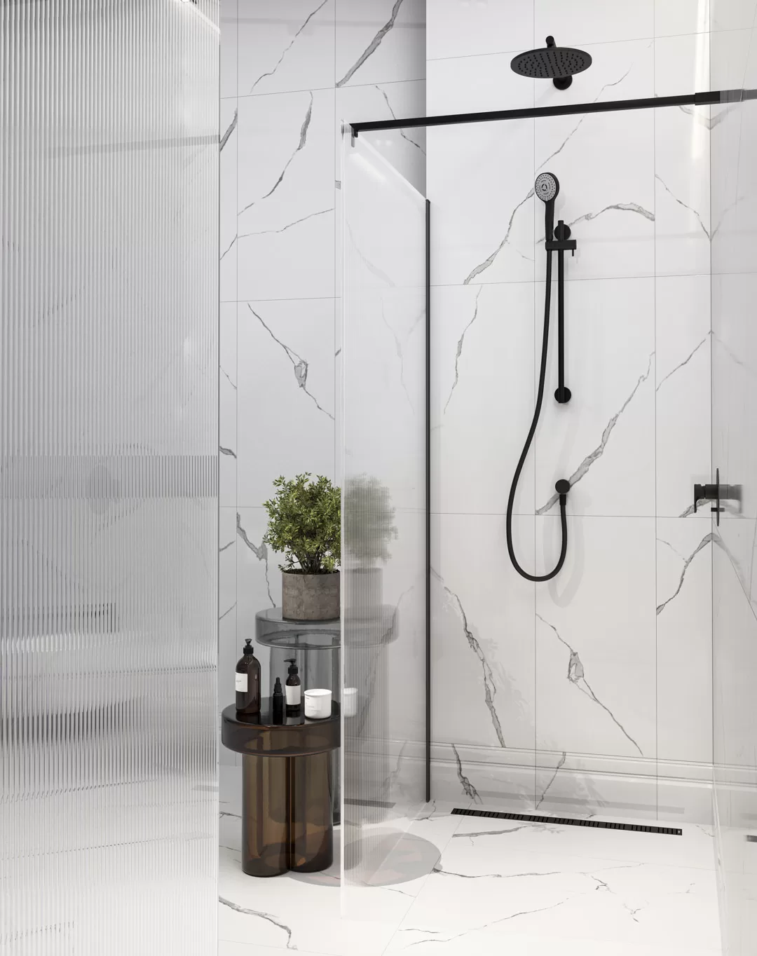 Добавить изысканности и лёгкости «мраморному» интерьеру поможет настенная плитка, а также декоративные элементы: два вида мозаичных декоров и бордюры. В дополнение к керамограниту, плитке и декорам выпускаются также клеёные ступени, подступёнки, плинтусы.