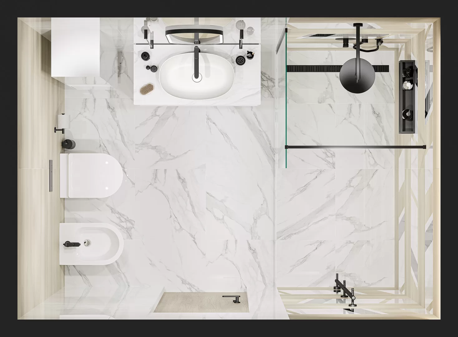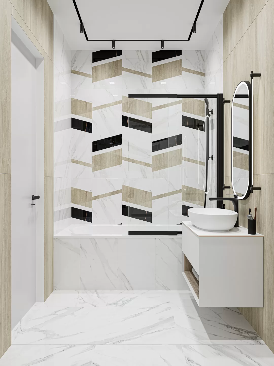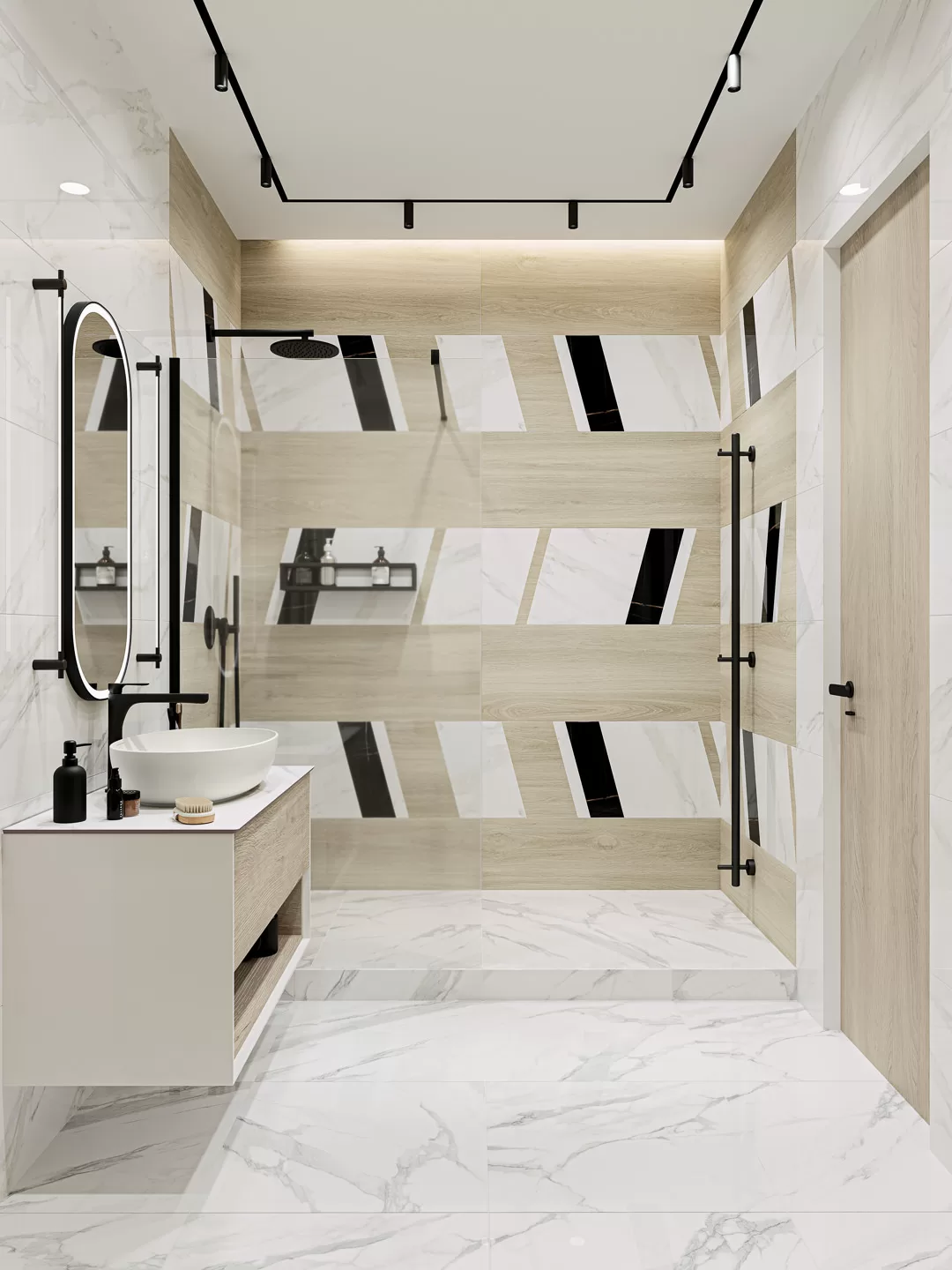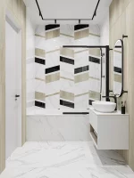 Добавить изысканности и лёгкости «мраморному» интерьеру поможет настенная плитка, а также декоративные элементы: два вида мозаичных декоров и бордюры. В дополнение к керамограниту, плитке и декорам выпускаются также клеёные ступени, подступёнки, плинтусы.