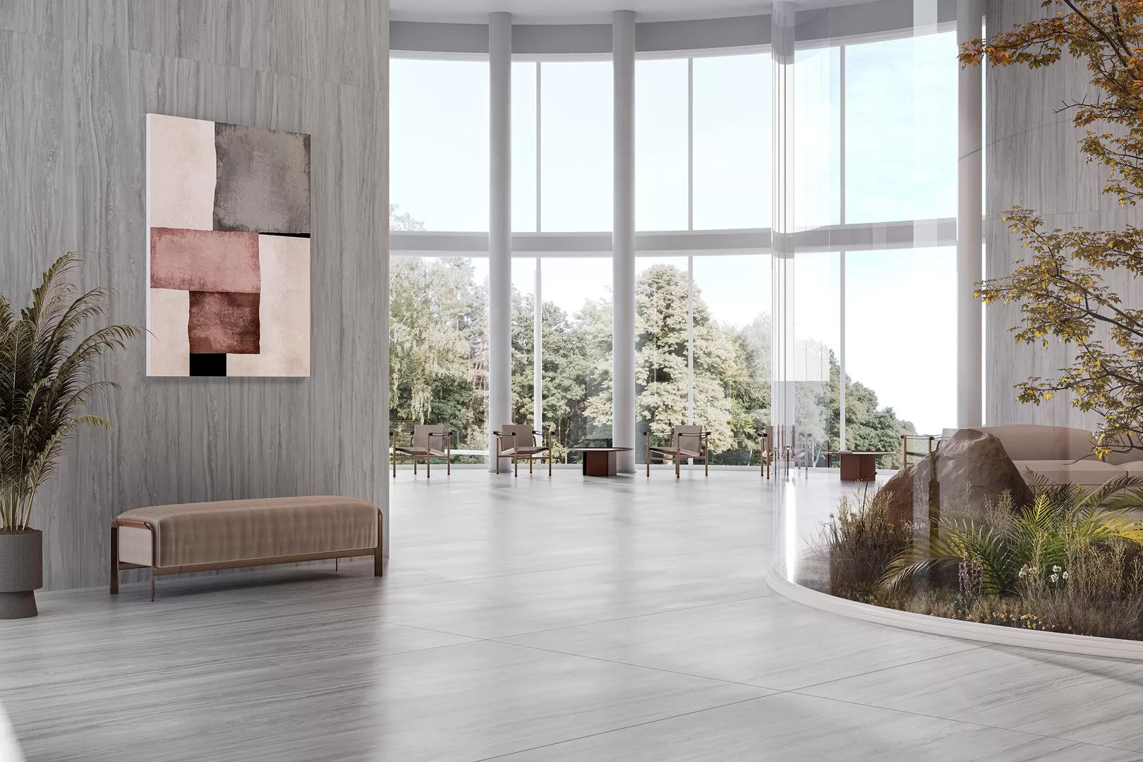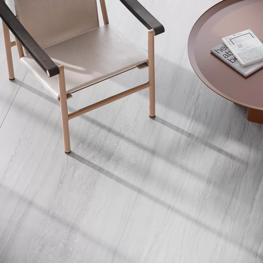 Отличительная черта греческого мрамора «Нестос» — параллельно расположенные полосы белого и серого цветов: они образуют ритмичную структуру, напоминающую светлое дерево. Максимально полно самобытная графика минерала раскрывается на больших бесшовных поверхностях. В отличие от природного материала, одноименный керамический гранит не боится царапин и других механических воздействий.