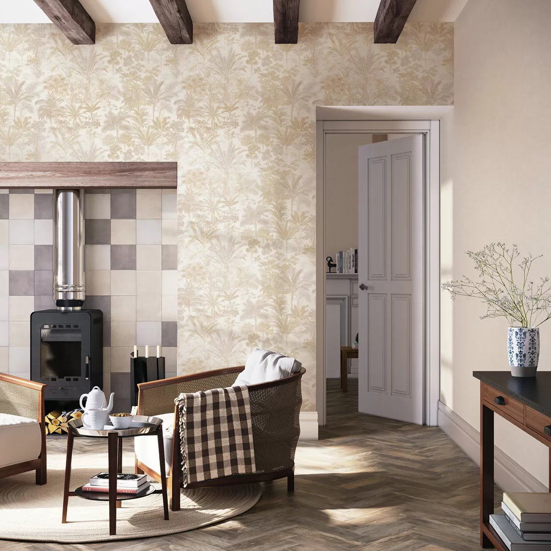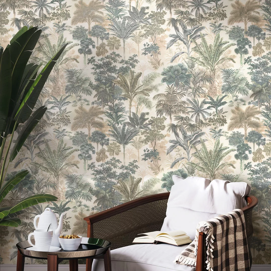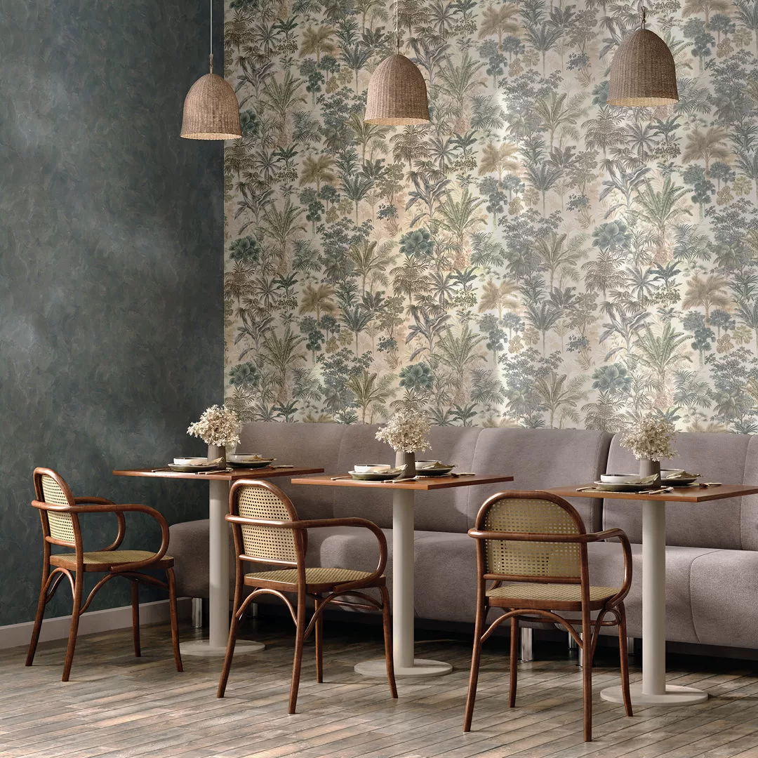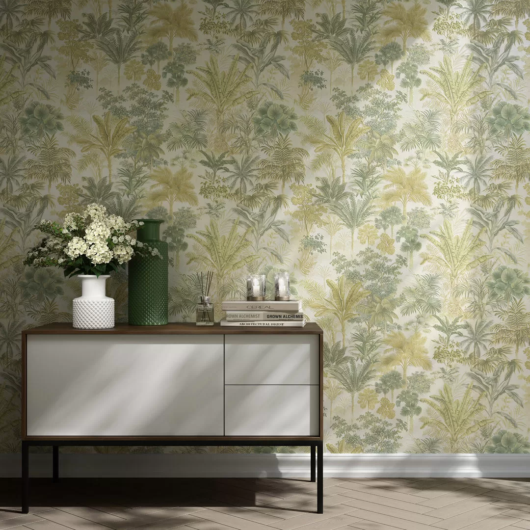 Эти обои приглашают под сень тропических деревьев: создать в помещении комфортную атмосферу помогает природная палитра, в которой решён мотив. Все пять вариантов выполнены в спокойной зелёной гамме, с деликатным тиснением по матовой поверхности.