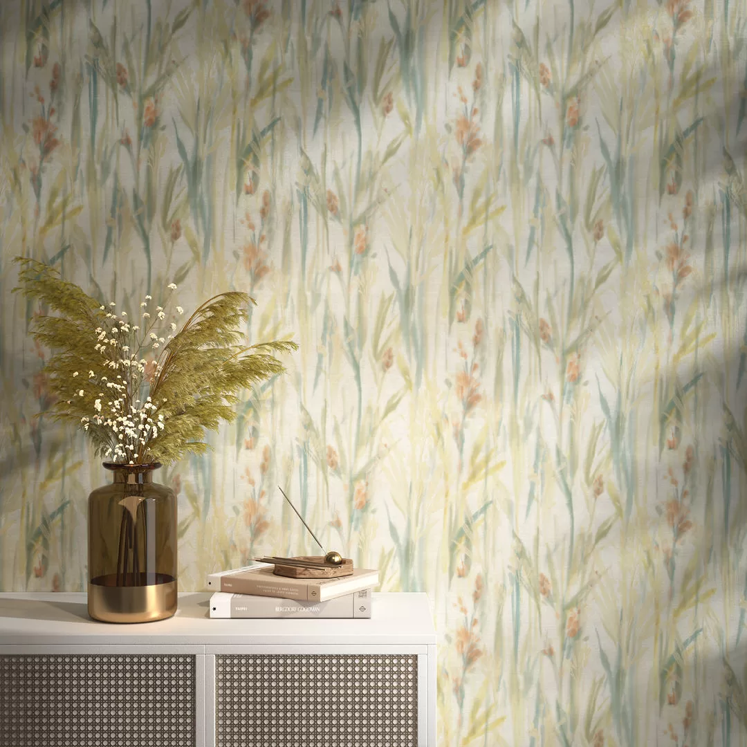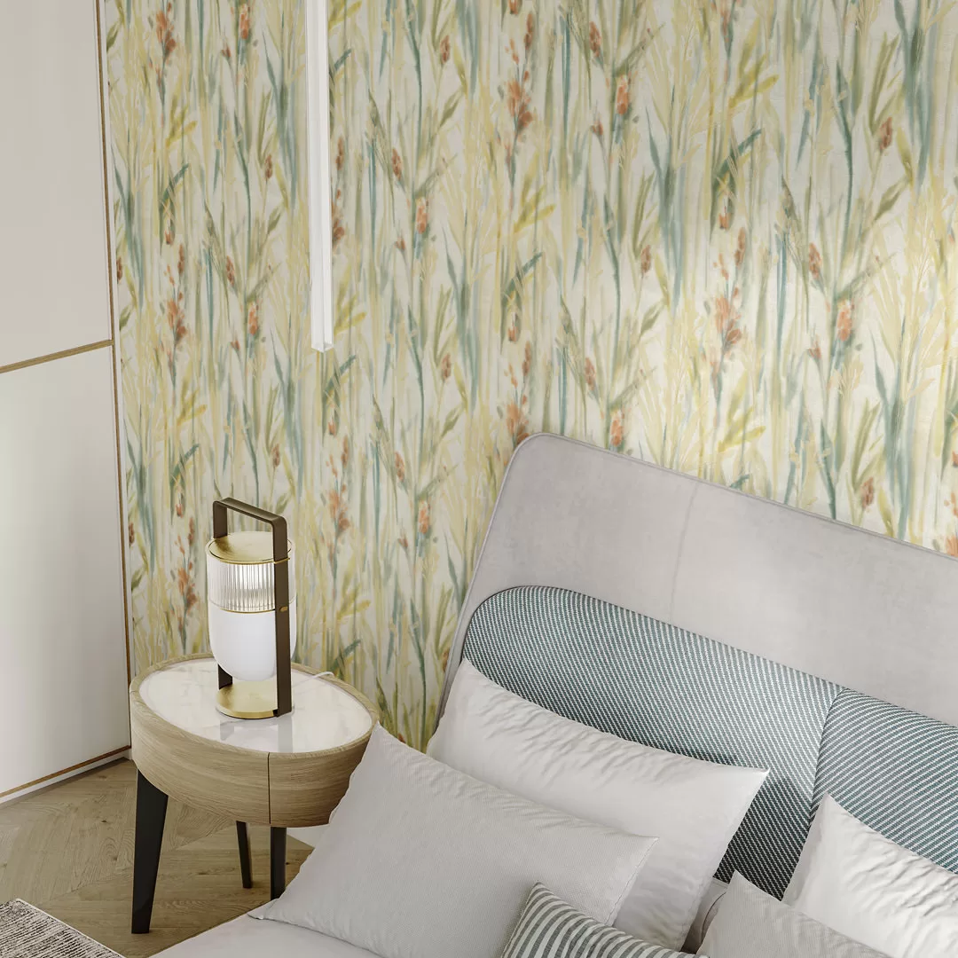 Флористический сюжет мотивов решён в акварельной стилистике. Фантазийные цветы, похожие на гладиолусы, на стене образуют живописное поле в цветовой гамме, содержащей несколько оттенков.