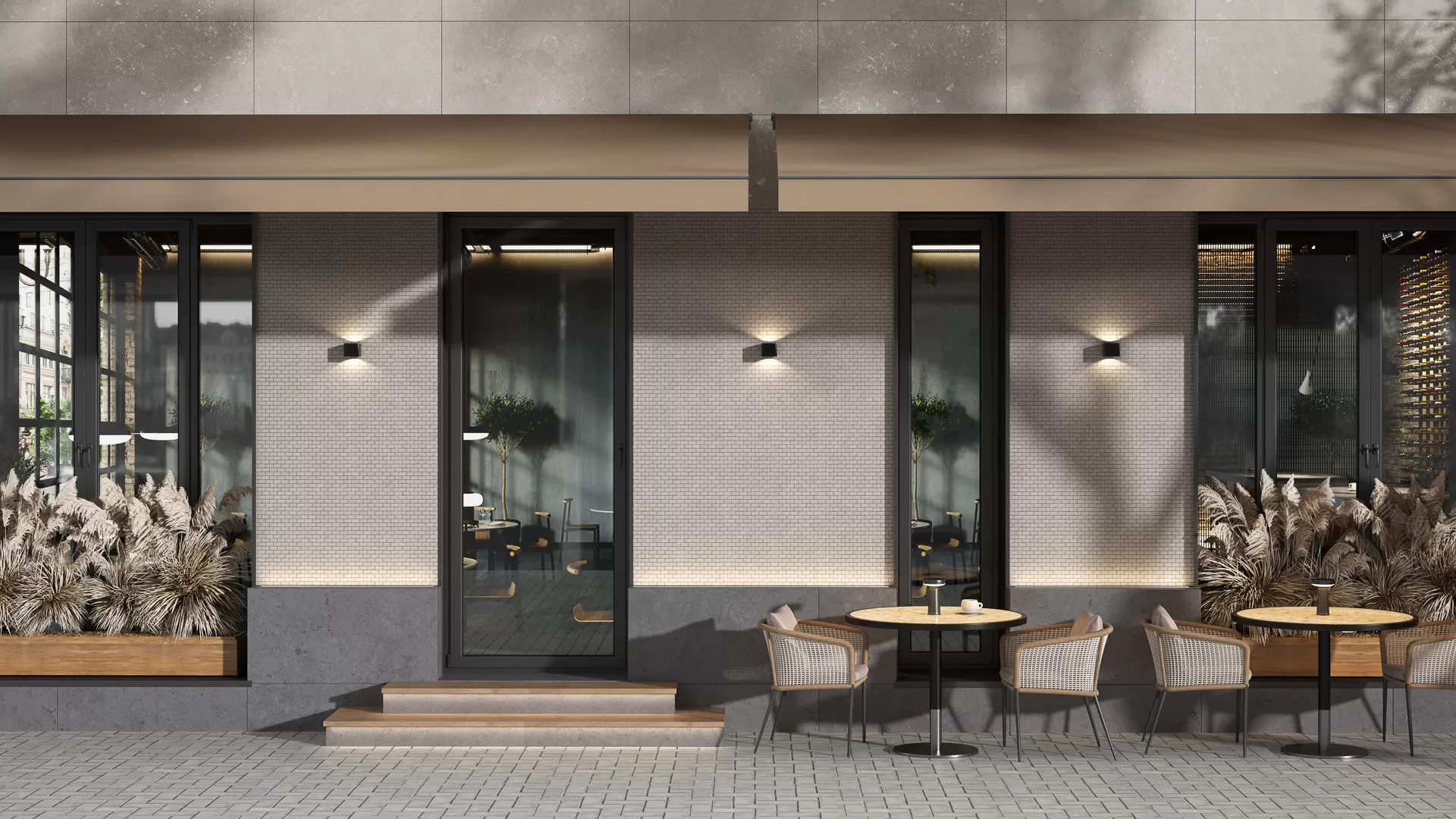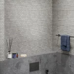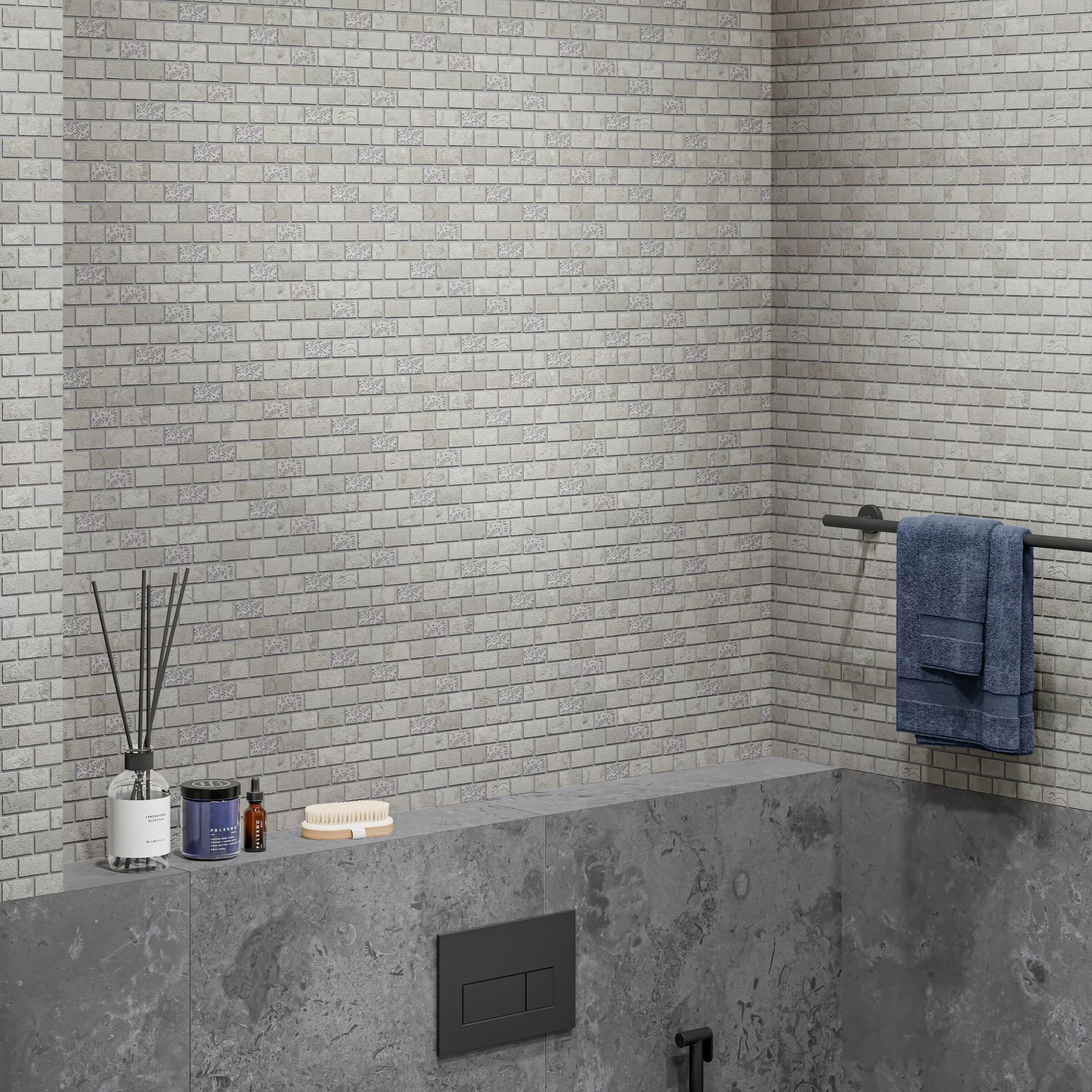 В мозаике «Про Лаймстоун Антика» керамический камень серого и бежевого цветов нарезан в форме кирпичиков, намеренно состаренных и собранных в полотно со смещением между рядами. Серия представляет два цвета — серый и бежевый: для обоих есть как базовые артикулы, так и декоративные элементы, где добавлены чипы с геометрическим узором.