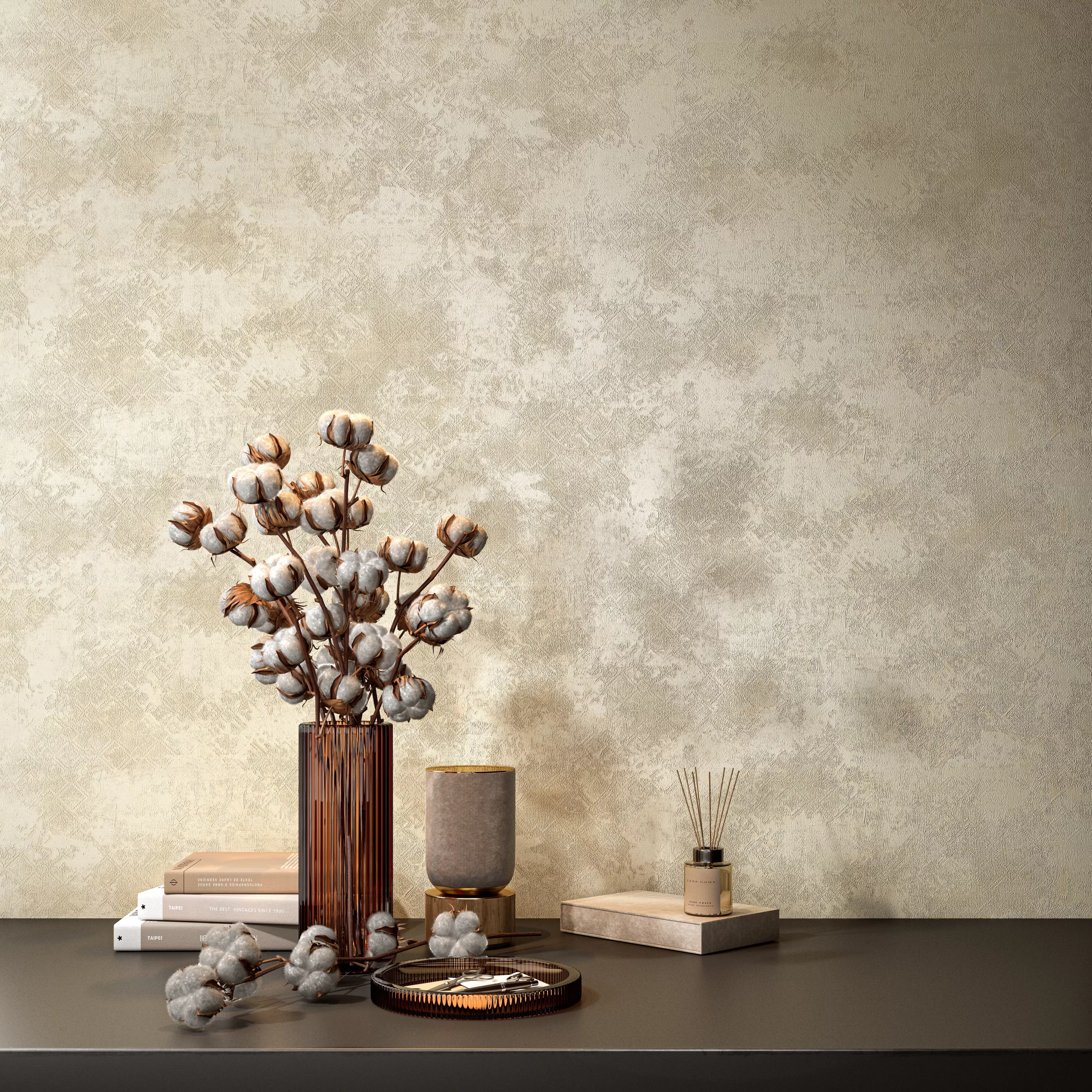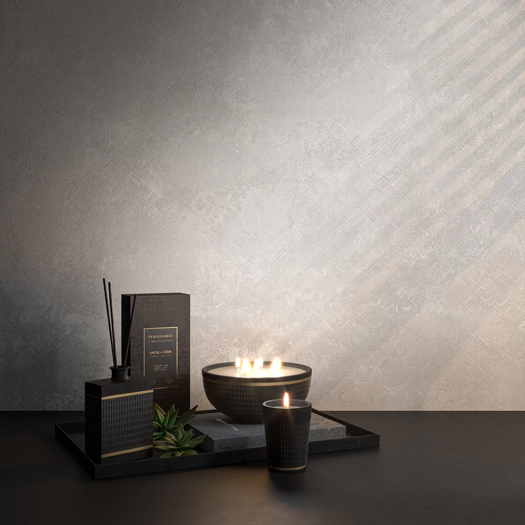 Четыре варианта базовых обоев решены в спокойных тонах, которые подойдут для любого интерьера, и содержат текстуру ткани с легким напылением золота и перламутра.
