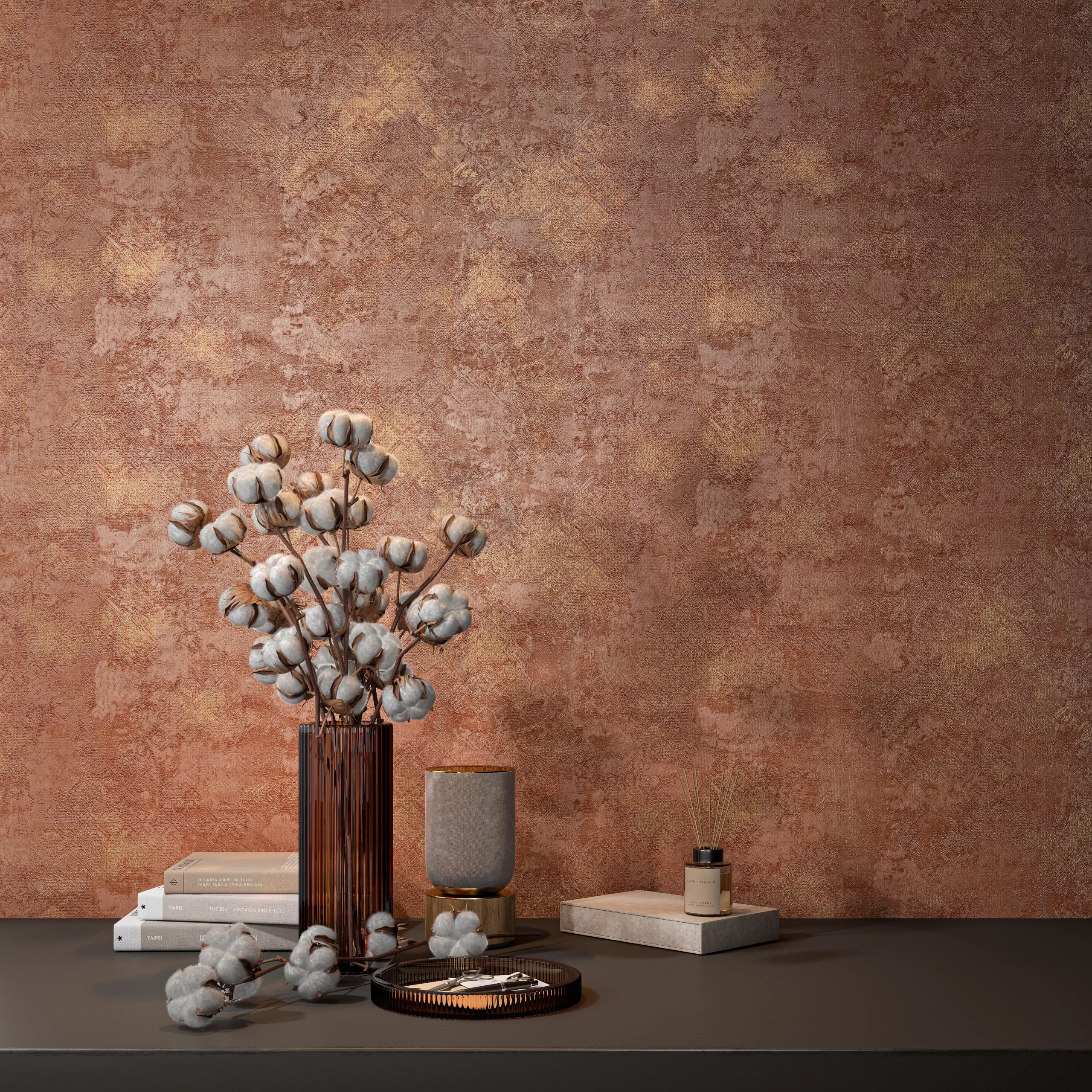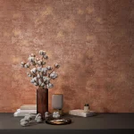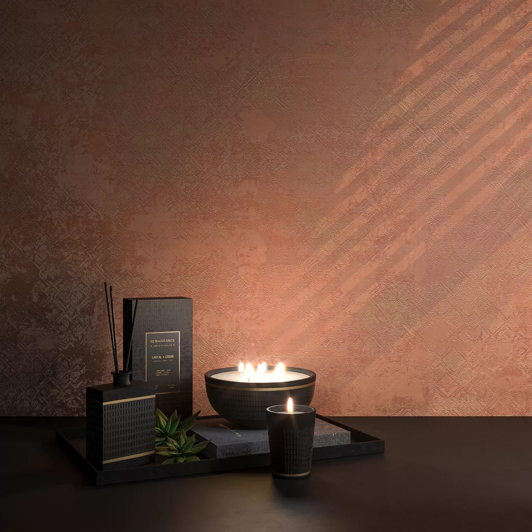 Помимо нескольких светлых цветов, в мотивах «Ренессанс» предложены два насыщенных артикула: коричневый и терракотовый. Терракота (от итал. terra cotta — «обожженная глина») очень характерна для культуры Италии и отлично передаёт её яркий средиземноморский колорит. В таком исполнении обои могут стать визуальным акцентом в обстановке гостиной, спальни или прихожей. Коричневый цвет передаёт эстетику стиля лофт с металлизированным эффектом.